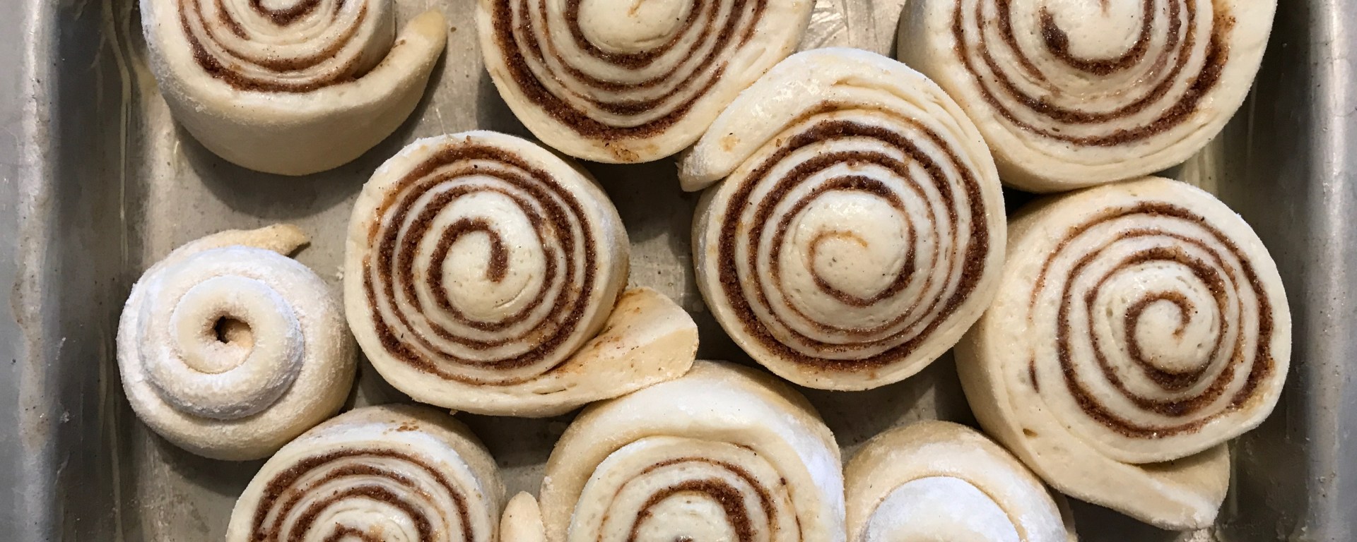 - In a small bowl, mix together brown sugar and cinnamon. Use your hands to sprinkle mixture over the buttered dough, then gently rub in into the butter a little. Tightly roll dough up, starting from the 9 inch side and place seam side down making sure to seal the edges of the dough as best you can. Cut into 2 inch sections with a serrated knife.