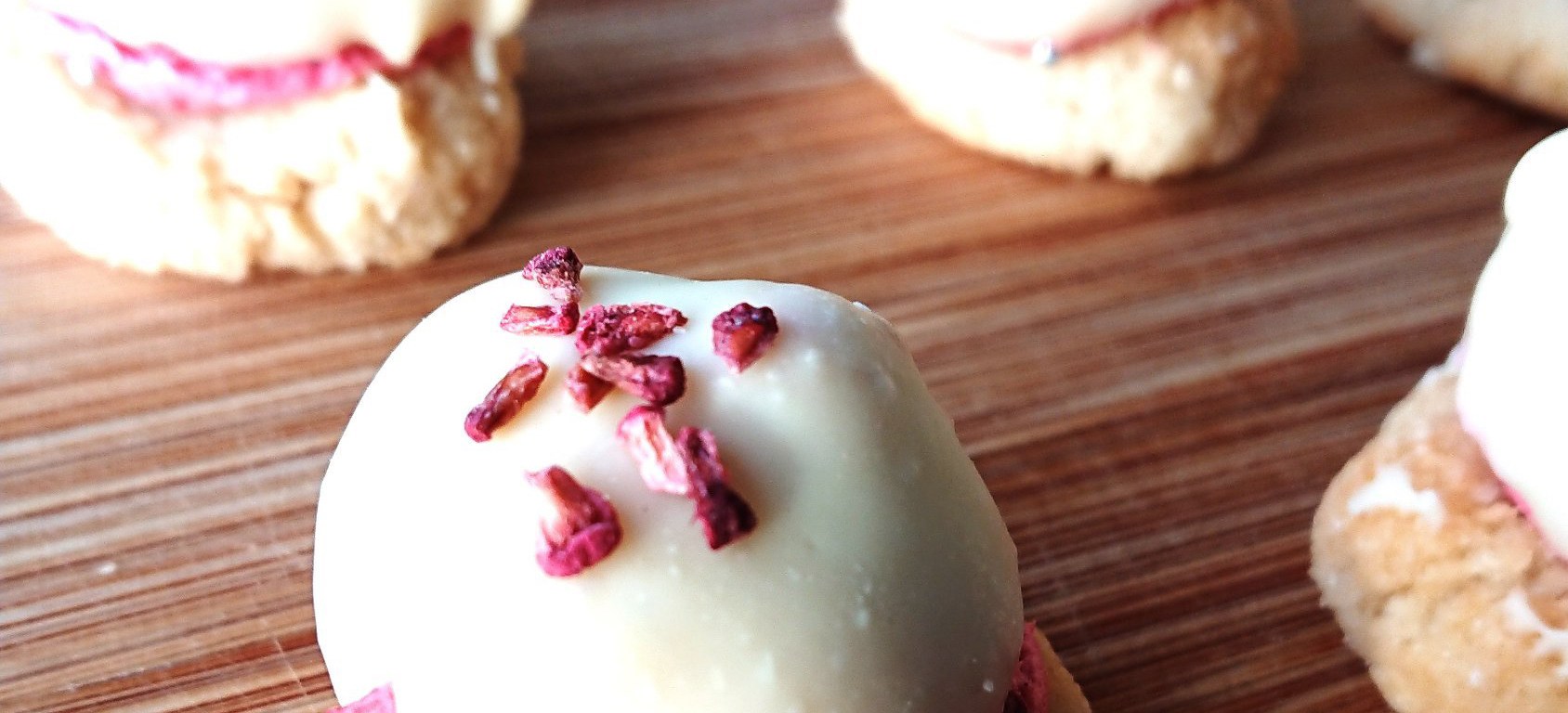 - Take out the almond and raspberry bites and dip each one in the white chocolate until completely coated. Then garnish with the dried raspberry (or sugar pearls) and then place back into the fridge for 15 min.