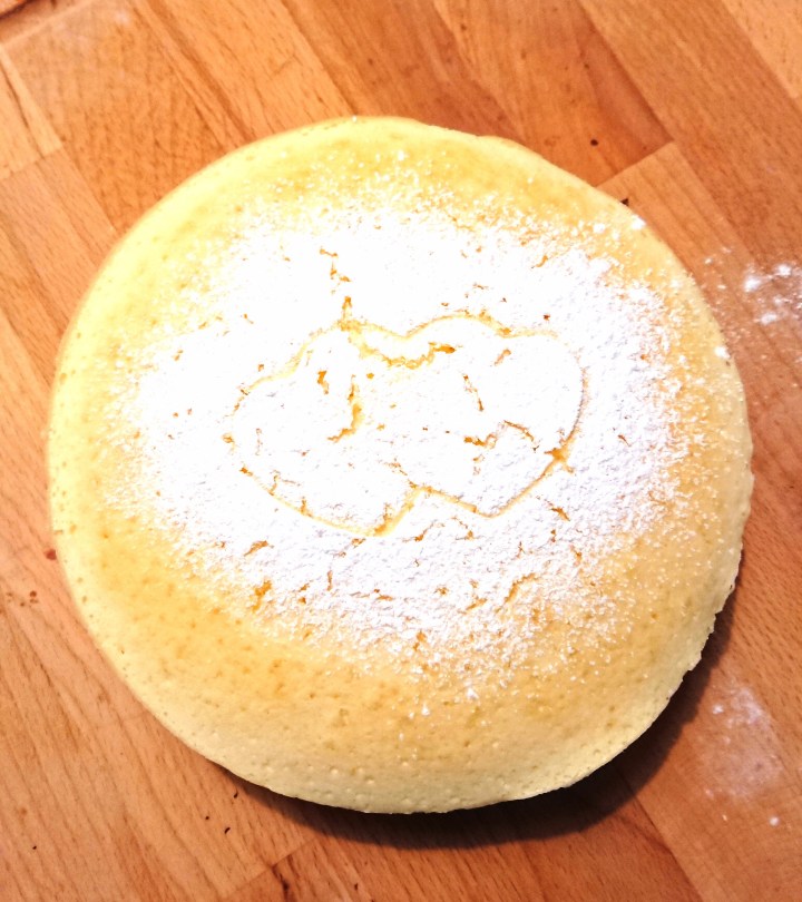 - Once cooled open your cake pan and carefull flip the cake ontop your hand to remove the bakign paper from underneath, then flip it back onto yoru serving plate. *NOTE you’ve got to do this quick, as the cake is so light and fluffy youll be left with imprints of your hand on the top if you leave it on your hand for too long!