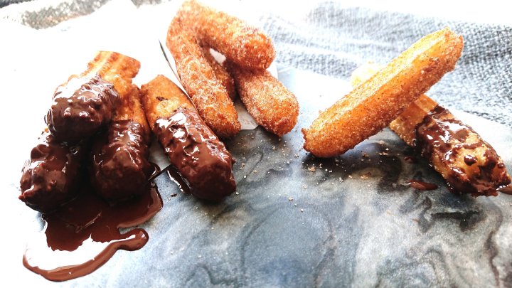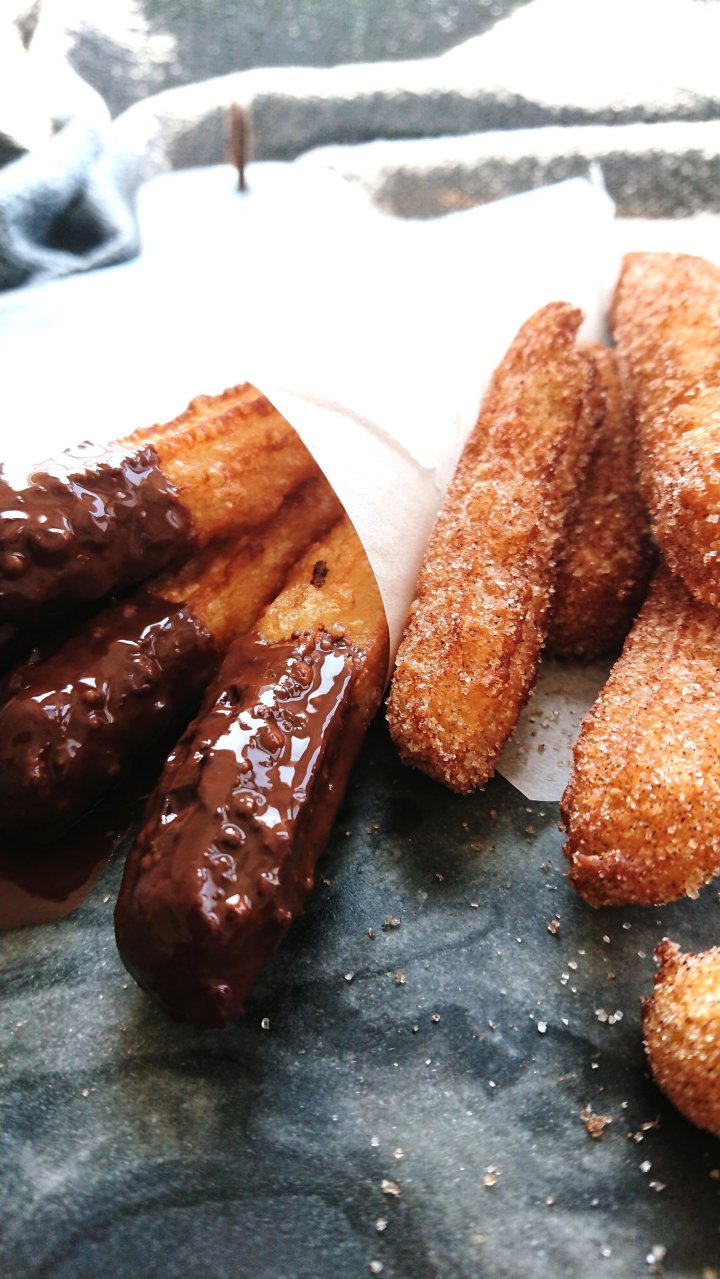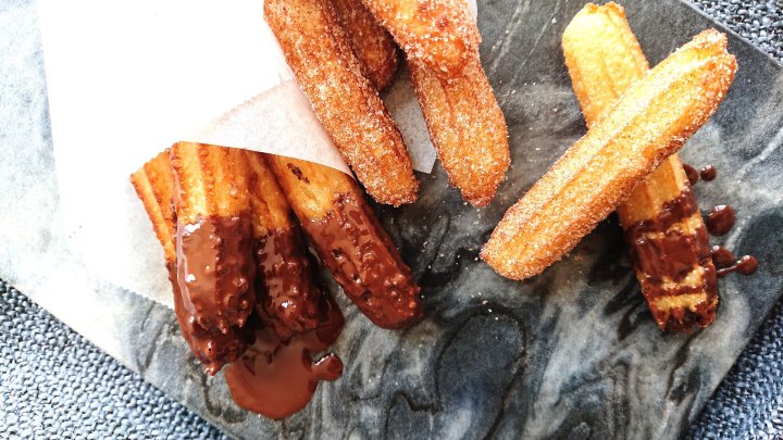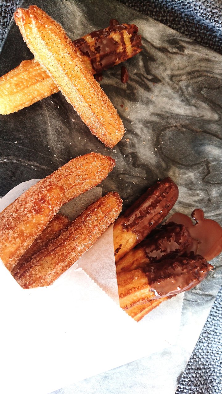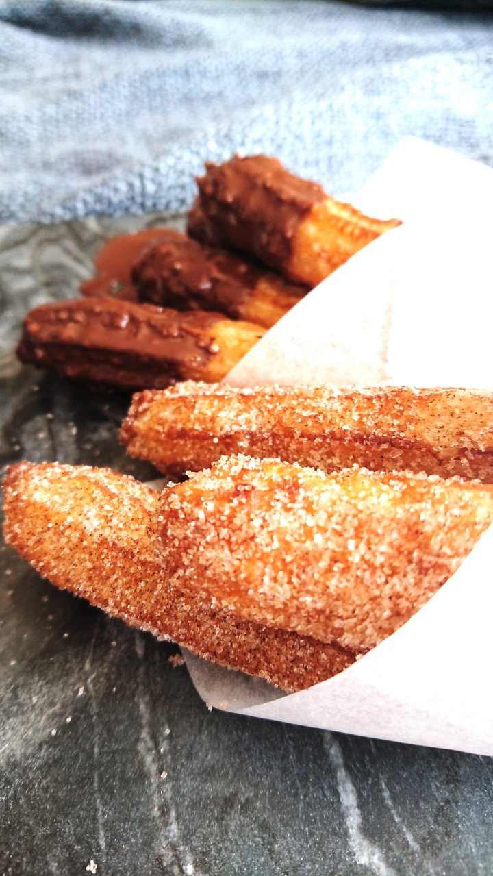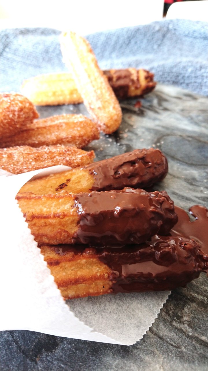 Melt your chopped chocolate with the coconut oil, and dip the churros into the chocolate. And voila!
