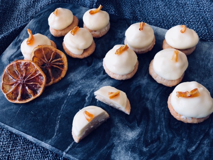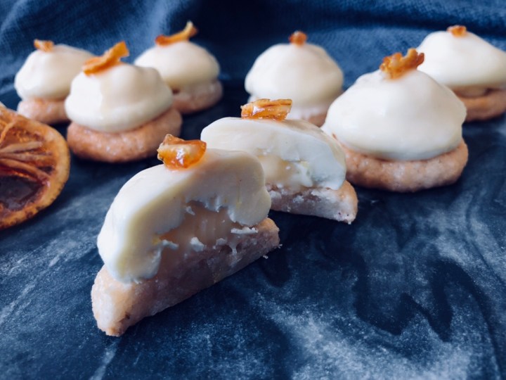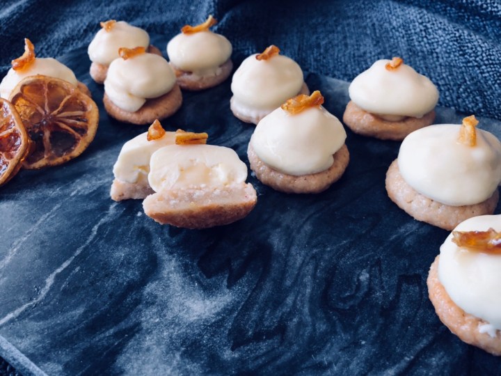 - Fill the buttercream to the rim of the biscuit making sure you start piping form above the curd so you cover it whilst piping. Once they are all piped with the buttercream, place them back into the freezer for another 15 min, until hard.