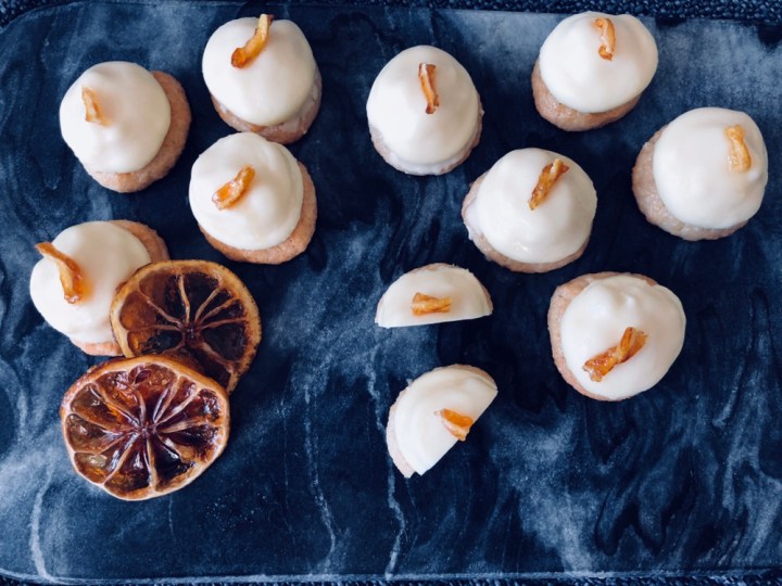 - Once all of your biskvi have a generous drop on them, place them into the freezer fro 15 min. Once the curd is stiff, take them out and pipe the lemon buttercream over the curd.