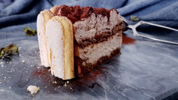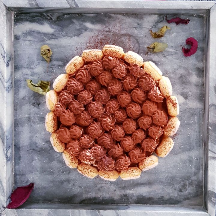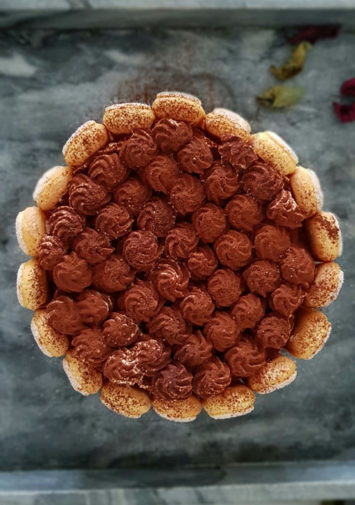 - Cover and chill for roughly 4-5 hours or overnight. Once ready, dust with cocoa powder over the top. I used to a detachable cake pan, so I added a little extra touch by carefully sliding the tiramisu over onto a serving dish, and using some extra finger cookies I placed the cookies onto the sides of the cake, covering it all the way around. ( You can keep the Tiramisu in the fridge for up to 2 days.