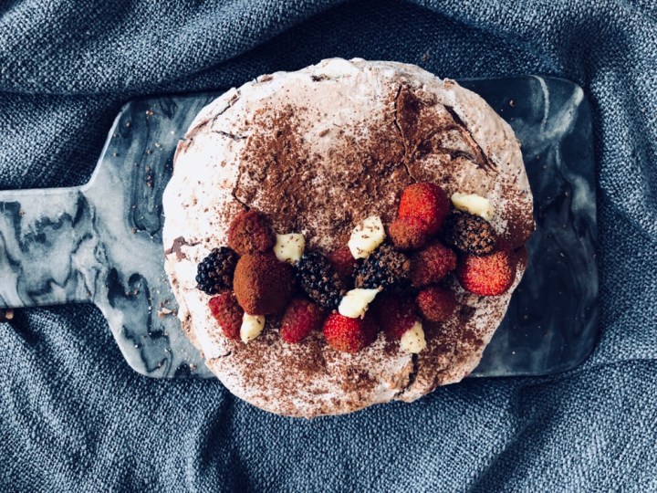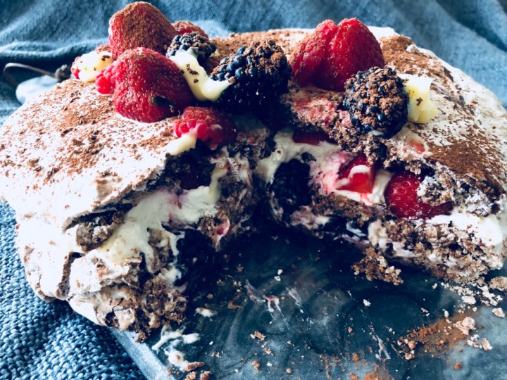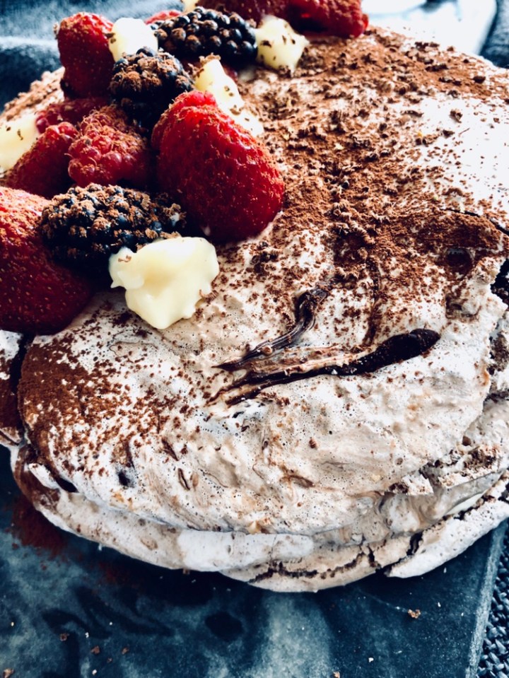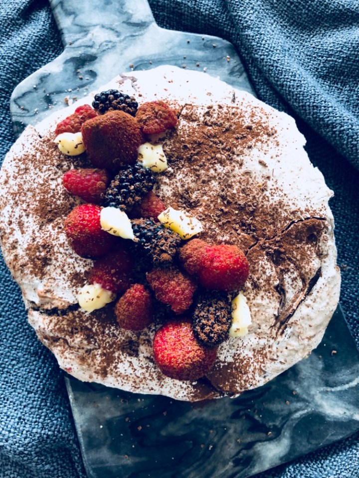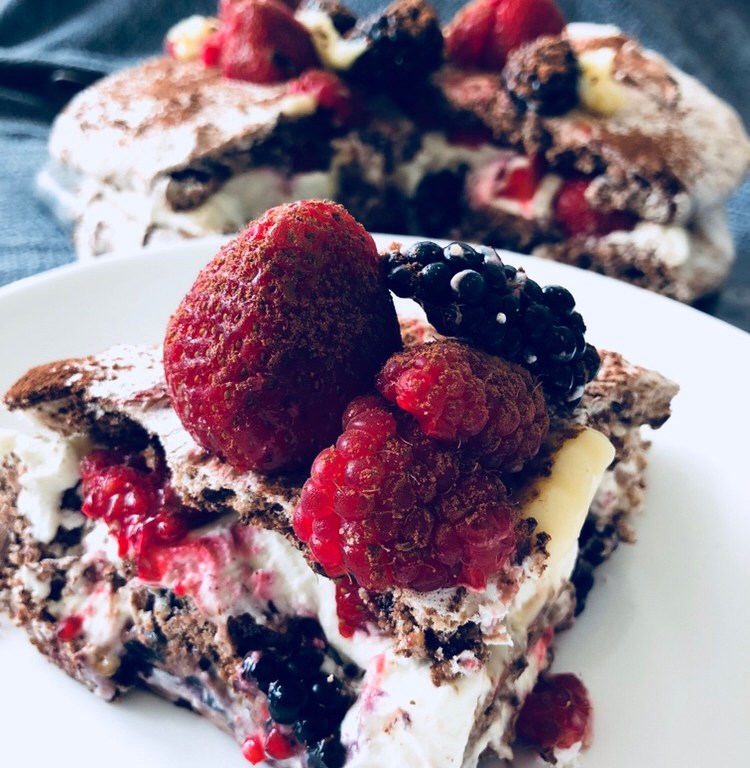 - Finish off by placing the final merengue ontop of the berries and decorate with some whole berries and cocoa powder. I also added a few dollops of lemon curd only because I love the zing flavor with berries and cream!