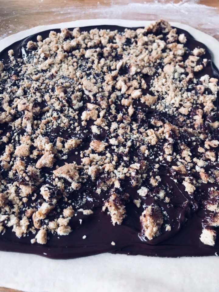 - Once the dough has rested overnight, take it out and let it rest till it gets to room temperature. This is VERY important, because once you start spreading the filling on, if the dough is still cold, the filling will crack and the dough will not roll up properly. While the dough rests, In a large heatproof bowl set over a saucepan of simmering water, melt both chocolates with the butter, stirring occasionally, until smooth. Let cool to room temperature, then stir in the cookie crumbs and honey.