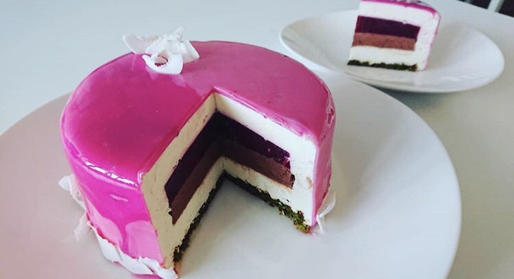 So here you guys have an Entrement! This is one of my absolut favourite types of cakes, although as it takes forever to make, i don’t make it often! But when I do, I’m drooling over it before its even done! if you have patience and energy, time and persistence, then try it out! Its beautiful! It is a coconut mousse, with a dark chocolate mousse insert and a raspberry jelly insert with a caramelised pistachio daquoise on the bottom. Plus It has the most talked about decorative design, the mirror glaze! If you want to make this, make sure you plan your time, it takes a while, its an over-night cake, so if you ever have someone or people that you really want to impress, then try it out! Trust me, neither you nor they will ever forget it! 😉