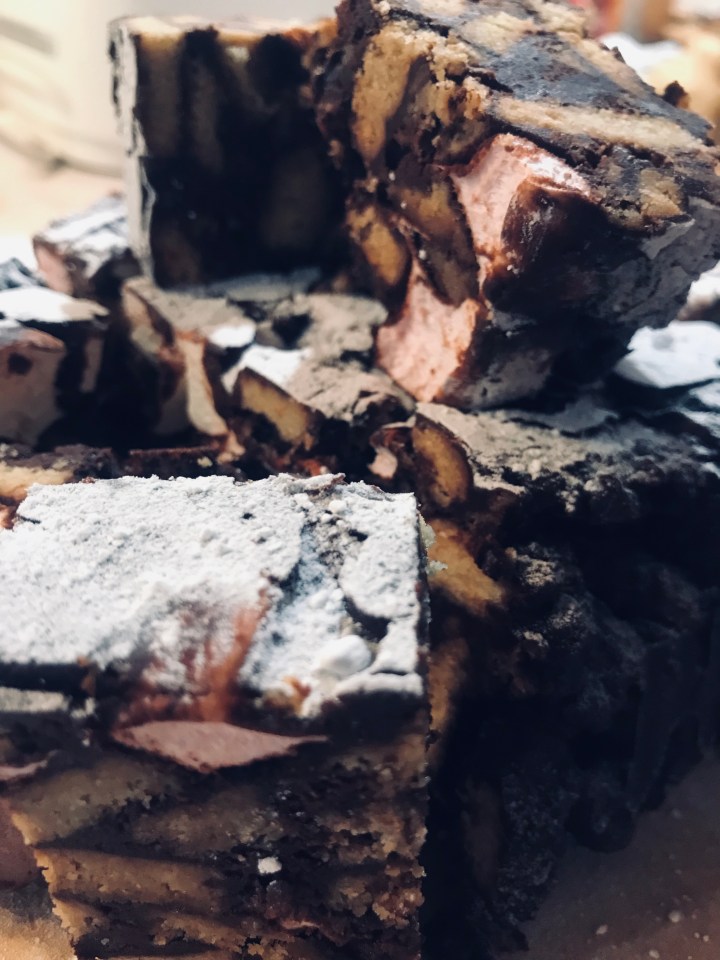 - Take the biscuits, the marshmallows, Honeycombe (optional), and the peanuts ( or which ever nuts you prefer) and stir into the chocolate mixture until everything is completely covered.