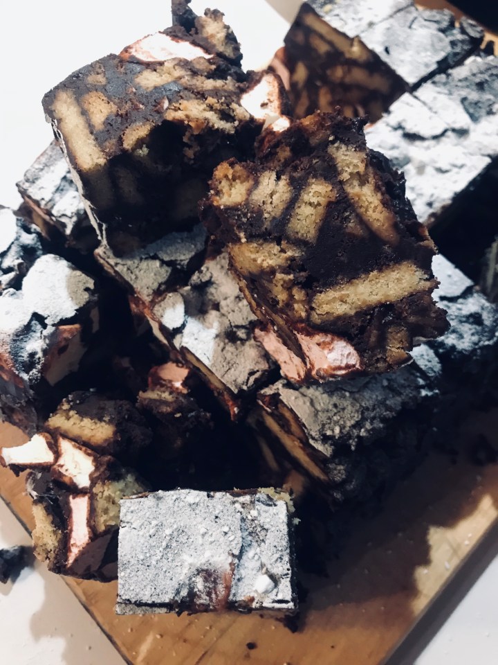 - Tip the mixture into the lined baking tin, and spread it out to the corners. Chill for at least 2 hrs then dust with icing sugar and cut into squares to enjoy!