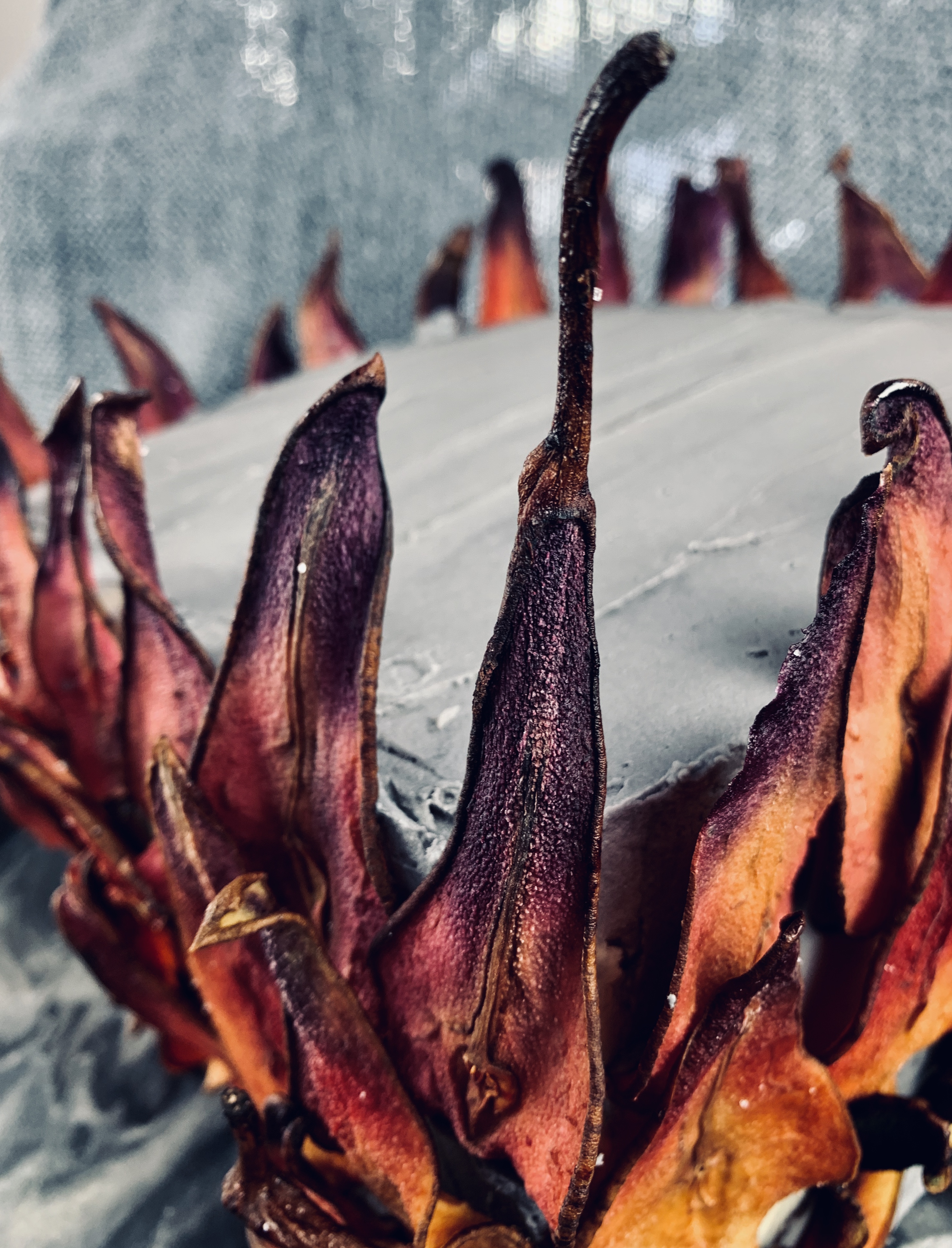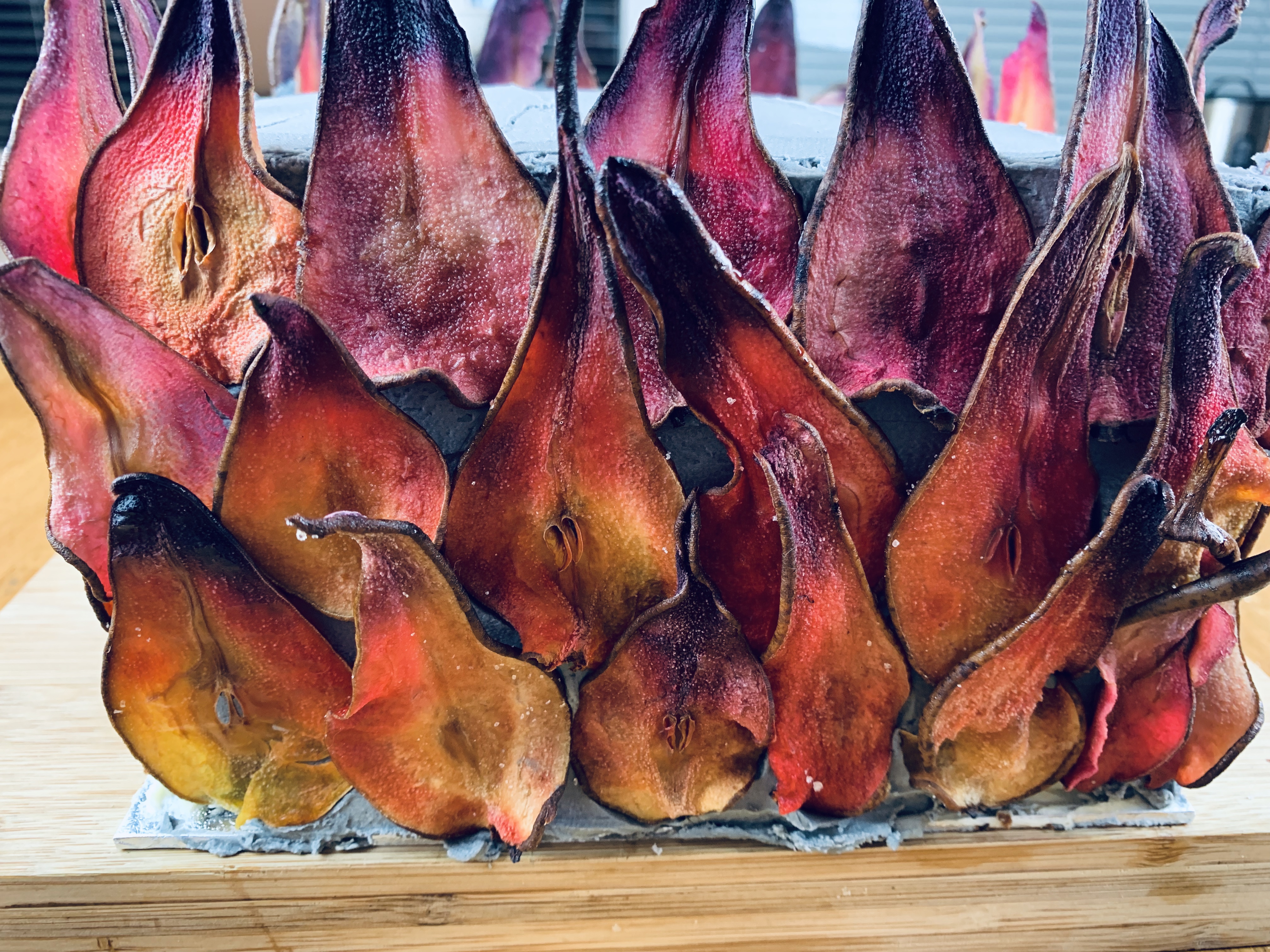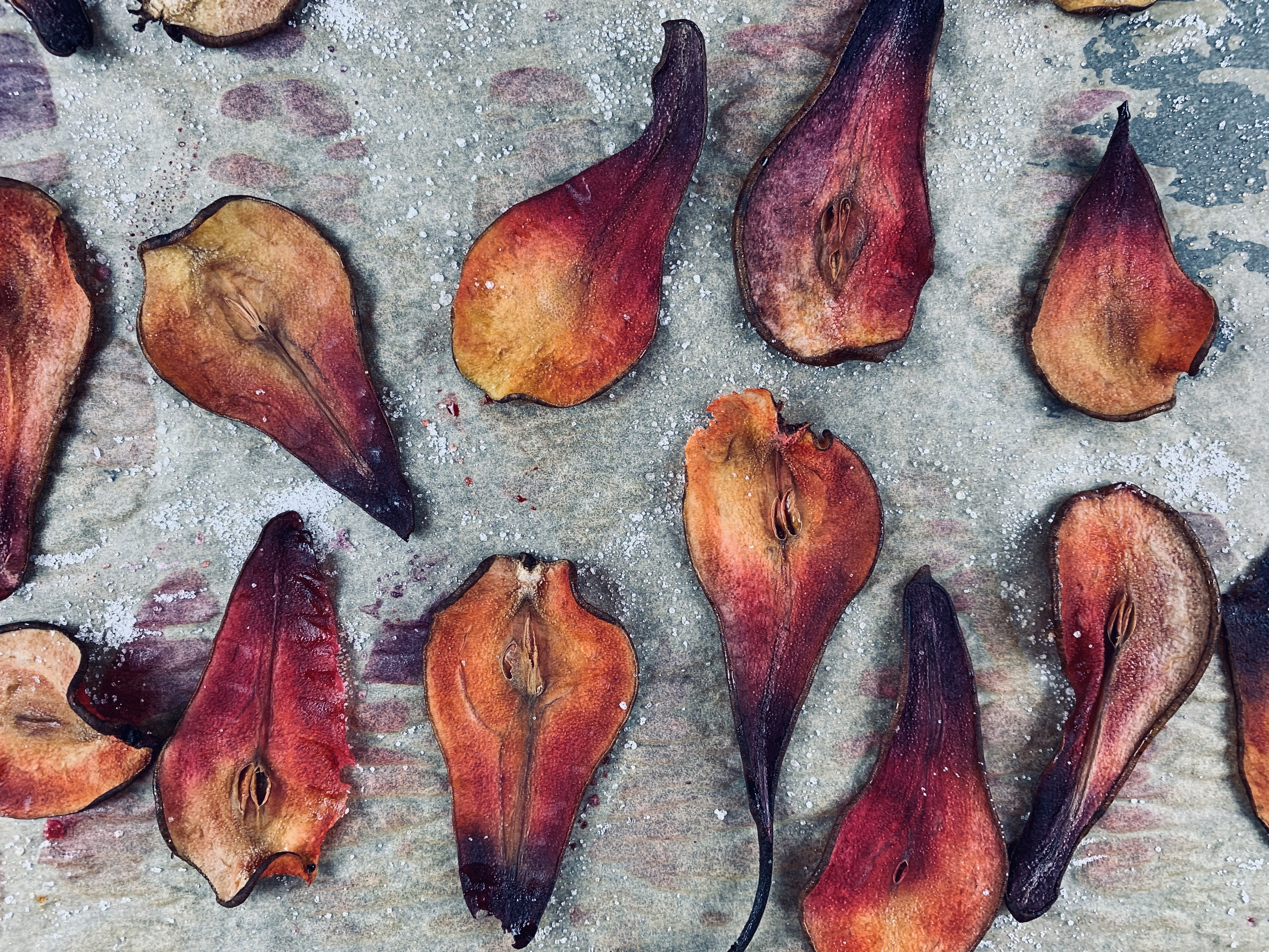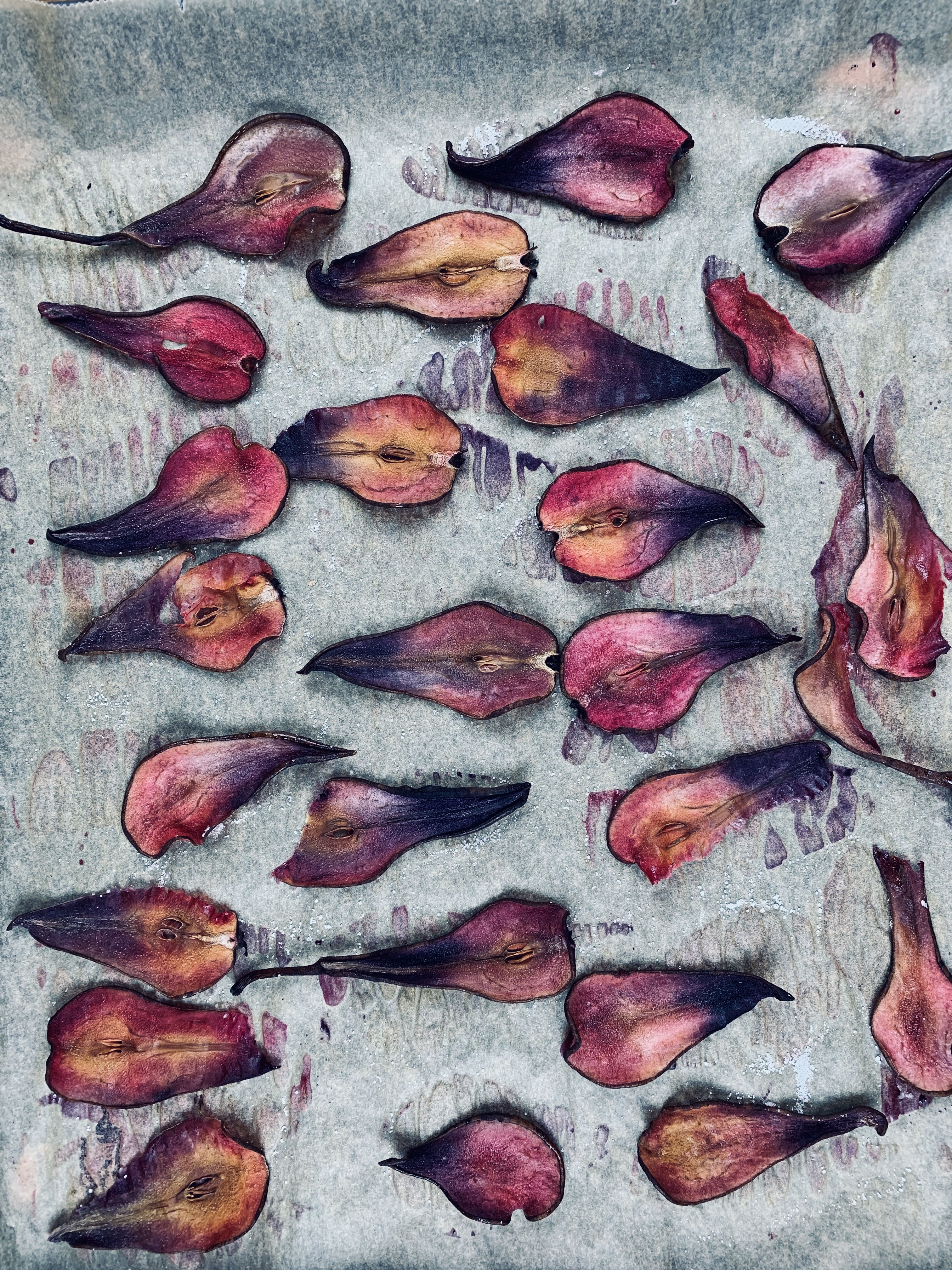 - Slice the pears from top to bottom, half ways, so you get a nice long slice. The thinner you slice them the faster they will bake and the more the colours will come out.