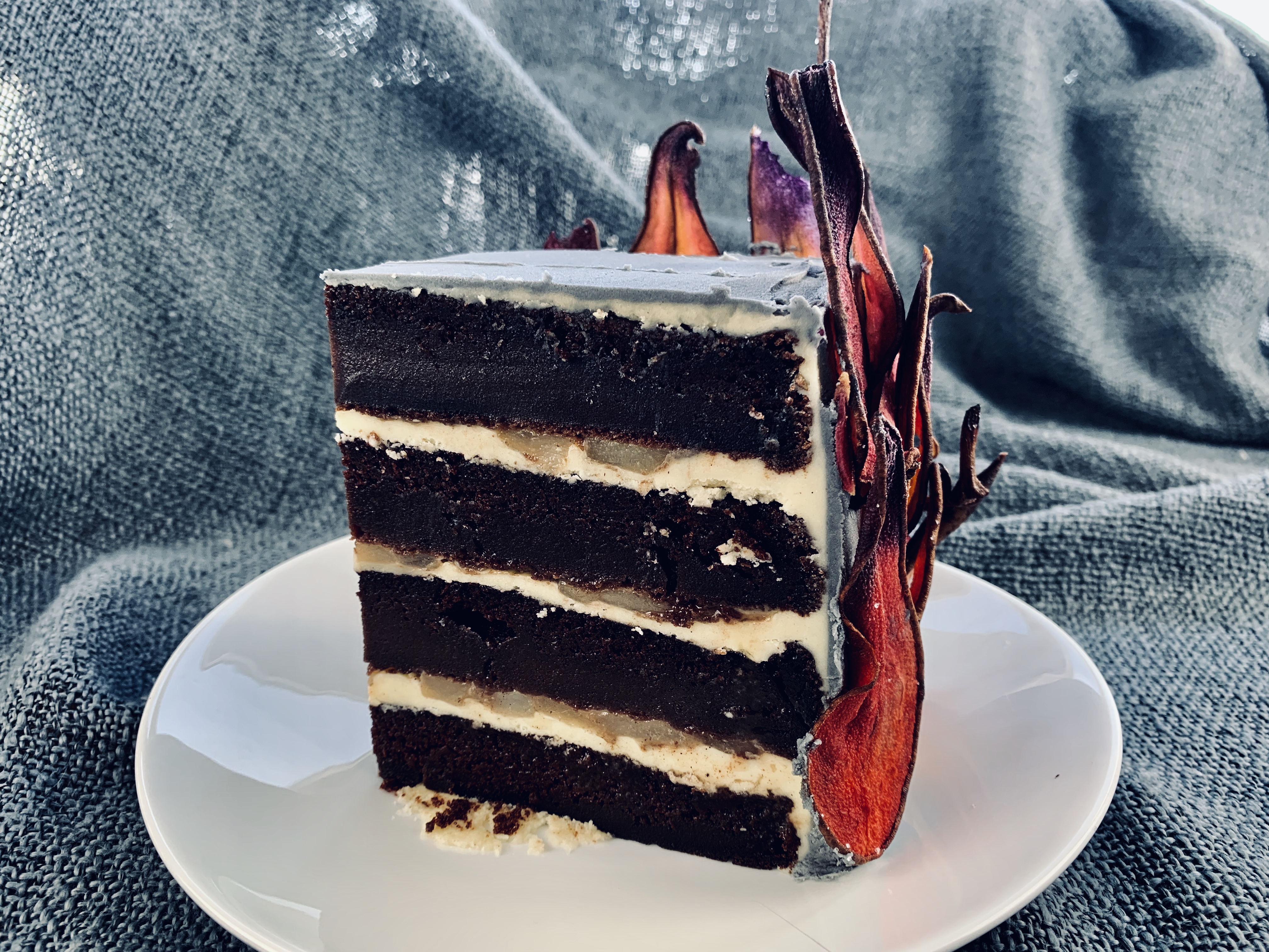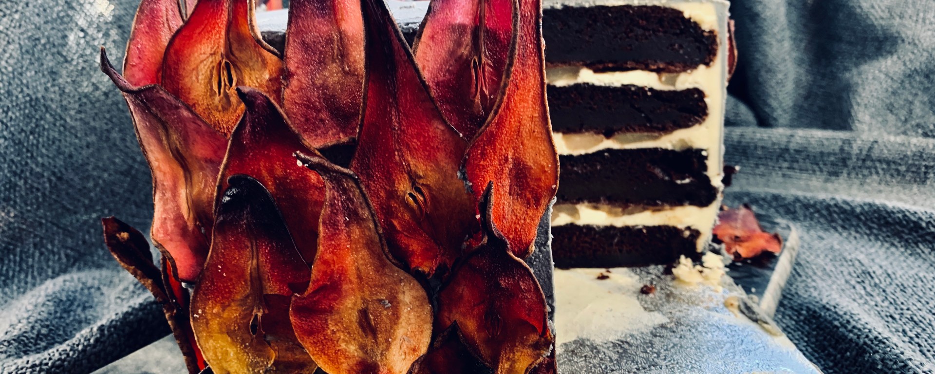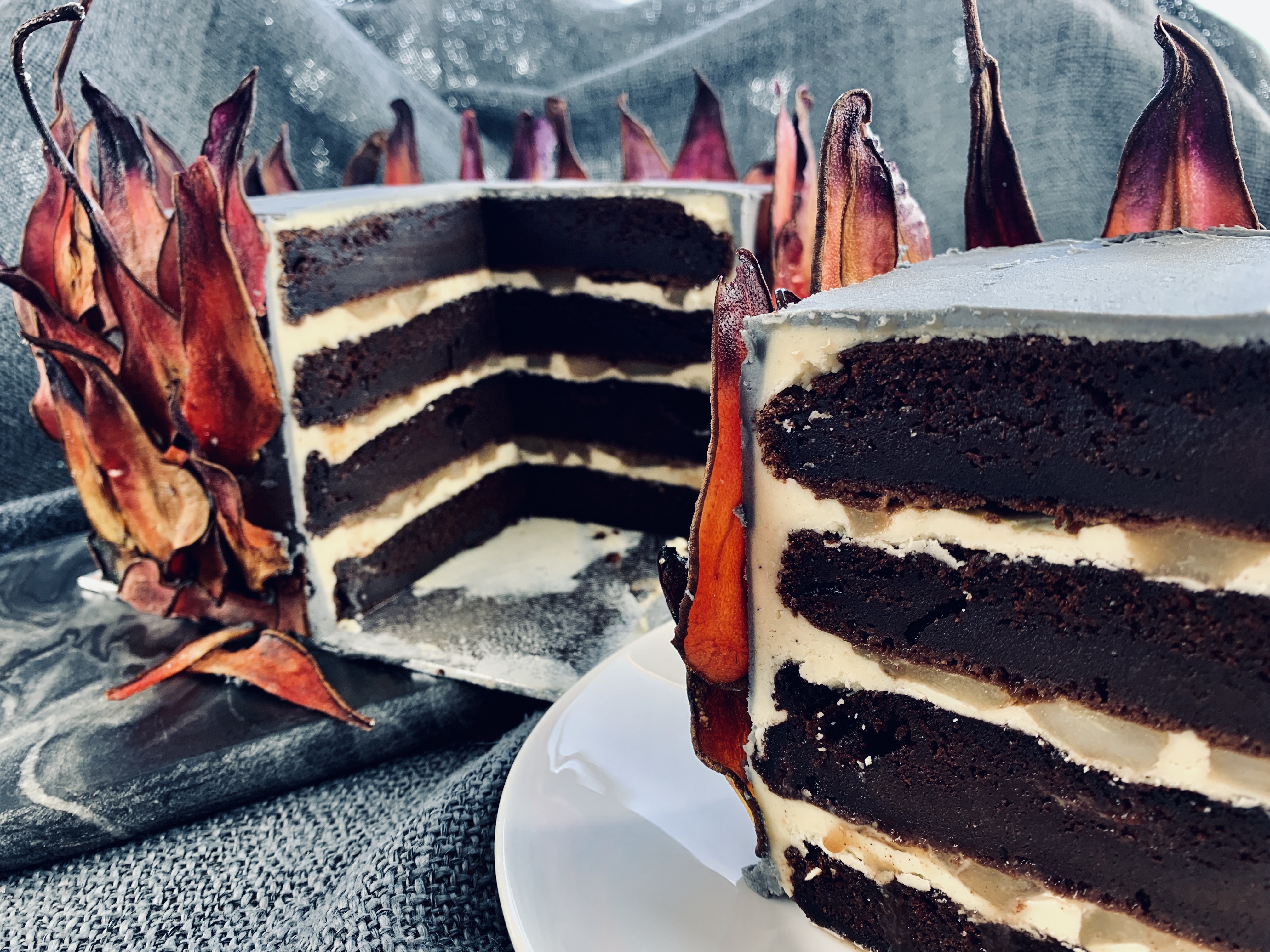 Hi my favourite bakers! So even though im going through an intense diet regime, it was my husbands granny’s 92nd birthday this weekend, and I juts HAD to bake a cake that was both beautiful as she is and as scrumptious as ever! I love being super creative and love painting, so I had seen some posts recently about these candied pears, that you paint. And I thought, lets see if I can do a watercolour wash on them.. but that was the decoration, then I had to create an entire cake based on that design! And thats when my mind went bananas.. Im using pears on the outside so it HAD to have pears on the inside! but pears dont have such a strong taste, so how do I enhance it, i thought.. and for some reason or another, I thought of Chai! Chai spice is basically cardamon, cinnamon, and nutmeg flavour… so I decide to soak the pears in a sugar syrup with all those spices, and create a four layers intense chocolate cake, with chai spice butter cream and some caramel drizzle to each layer as well as the chai soaked pears! … and OMG.. was it amazing or what! Like Mind Blown.. Mic Drop.. literally everything you can think of.. not only did it look amazing, but it tasted out of this world! Super proud of this one guys, and trust me , as most of my bakes are.. this one is easy to bake as well… the Painting of the pears takes a bit, but thats mainly the wait.. 😉 I honestly think this one is a show piece worth having at ANY party! 😉