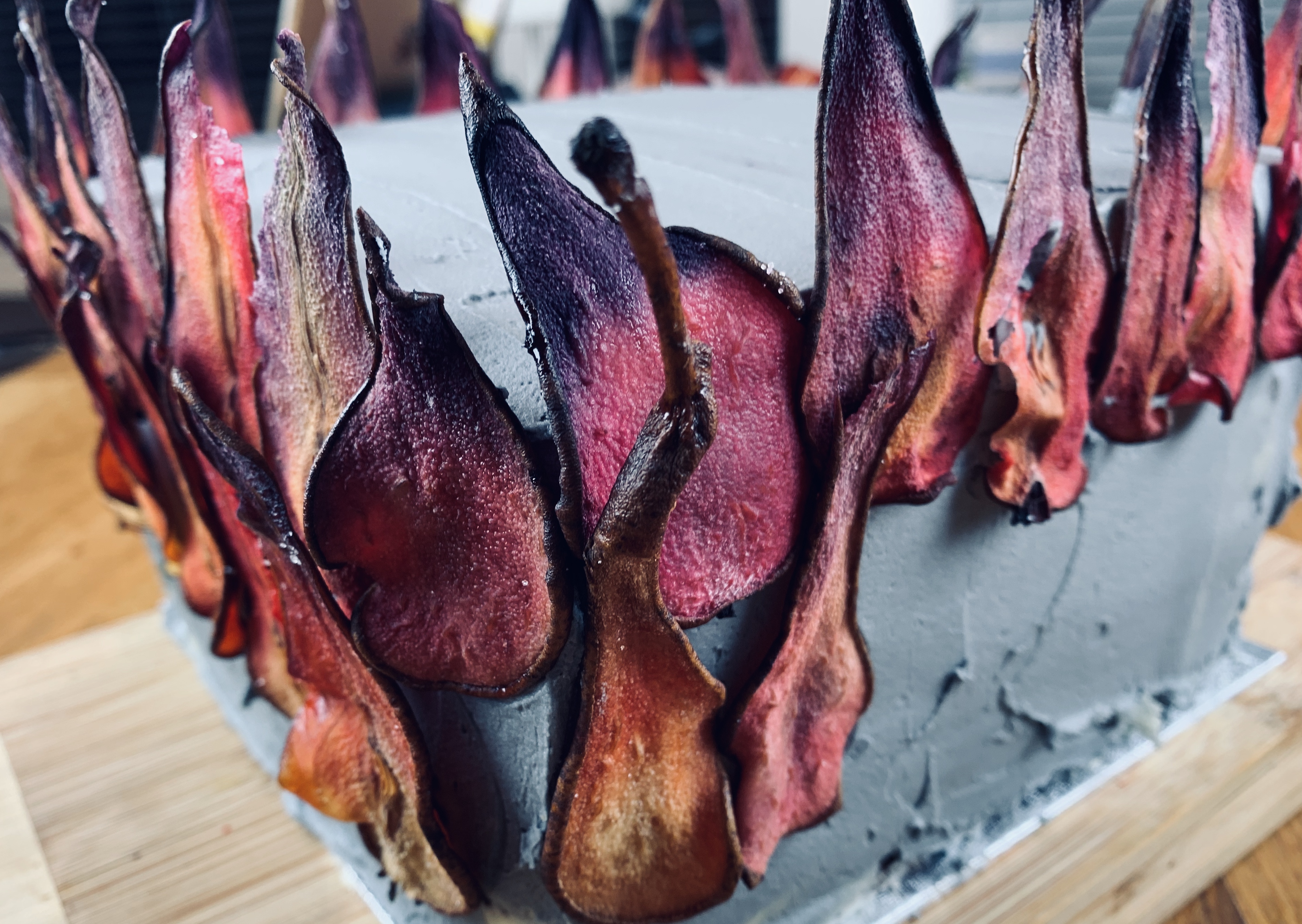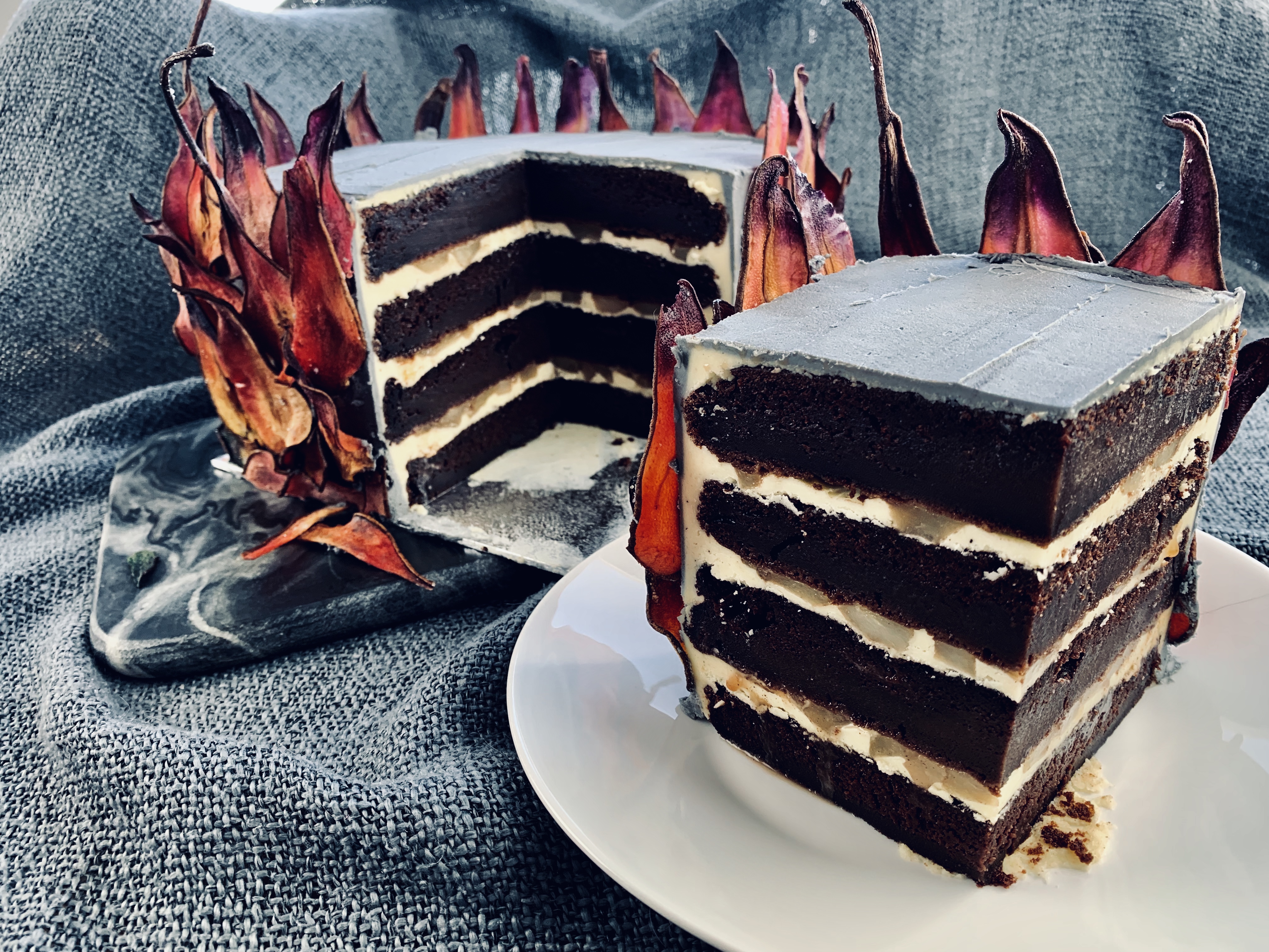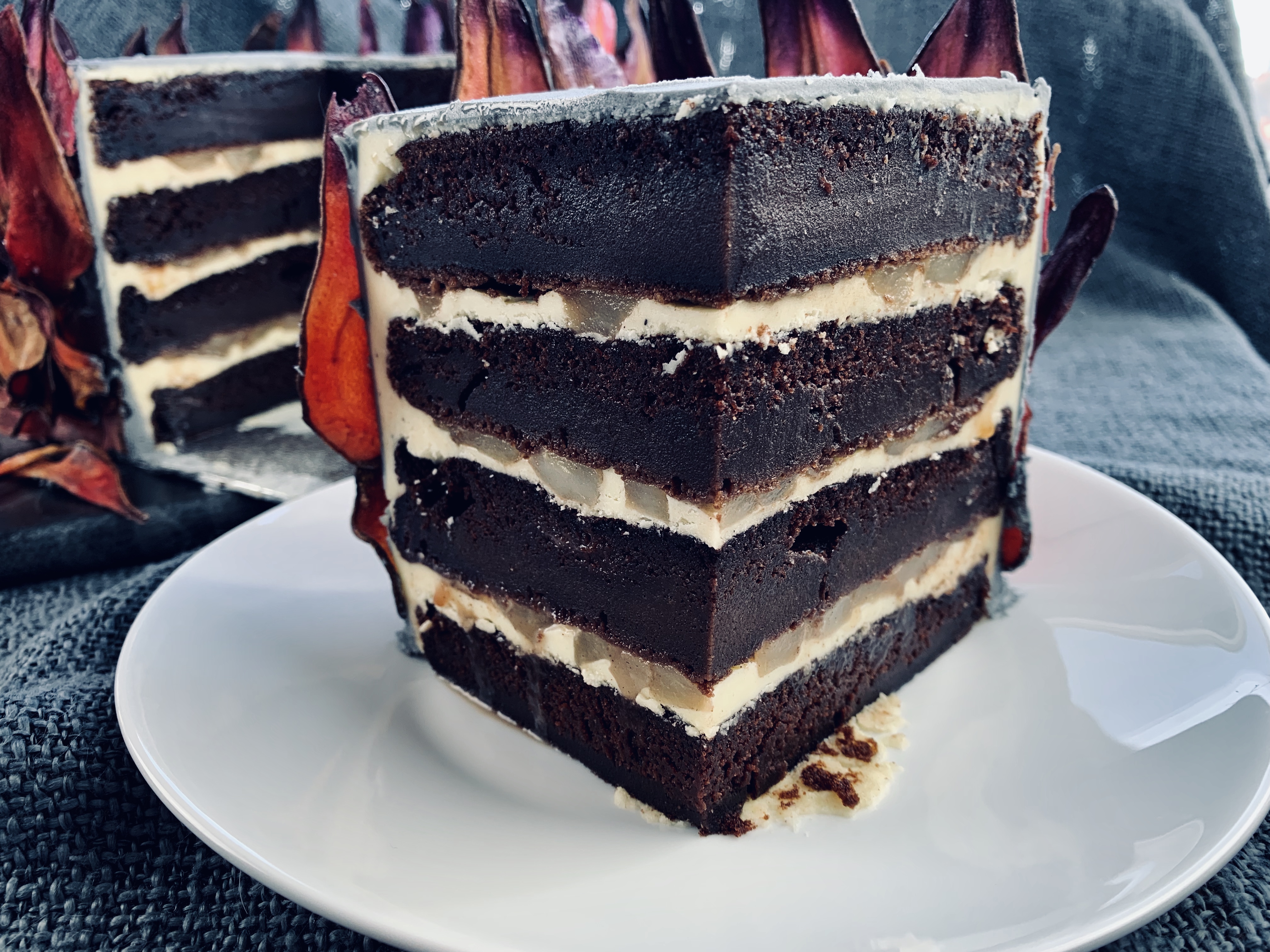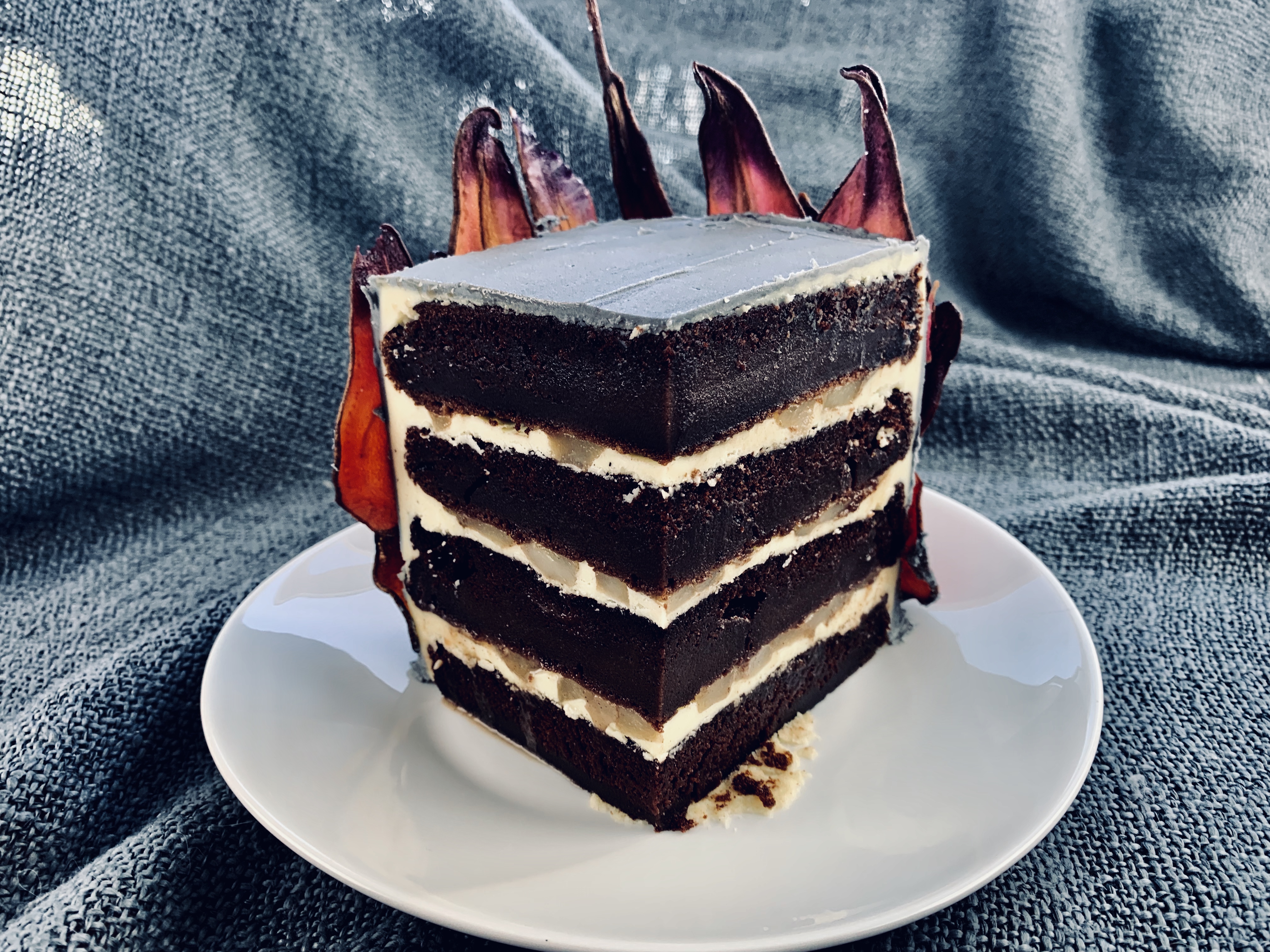 Hi my favourite bakers! So even though im going through an intense diet regime, it was my husbands granny’s 92nd birthday this weekend, and I juts HAD to bake a cake that was both beautiful as she is and as scrumptious as ever! I love being super creative and love painting, so I had seen some posts recently about these candied pears, that you paint. And I thought, lets see if I can do a watercolour wash on them.. but that was the decoration, then I had to create an entire cake based on that design! And thats when my mind went bananas.. Im using pears on the outside so it HAD to have pears on the inside! but pears dont have such a strong taste, so how do I enhance it, i thought.. and for some reason or another, I thought of Chai! Chai spice is basically cardamon, cinnamon, and nutmeg flavour… so I decide to soak the pears in a sugar syrup with all those spices, and create a four layers intense chocolate cake, with chai spice butter cream and some caramel drizzle to each layer as well as the chai soaked pears! … and OMG.. was it amazing or what! Like Mind Blown.. Mic Drop.. literally everything you can think of.. not only did it look amazing, but it tasted out of this world! Super proud of this one guys, and trust me , as most of my bakes are.. this one is easy to bake as well… the Painting of the pears takes a bit, but thats mainly the wait.. 😉 I honestly think this one is a show piece worth having at ANY party! 😉