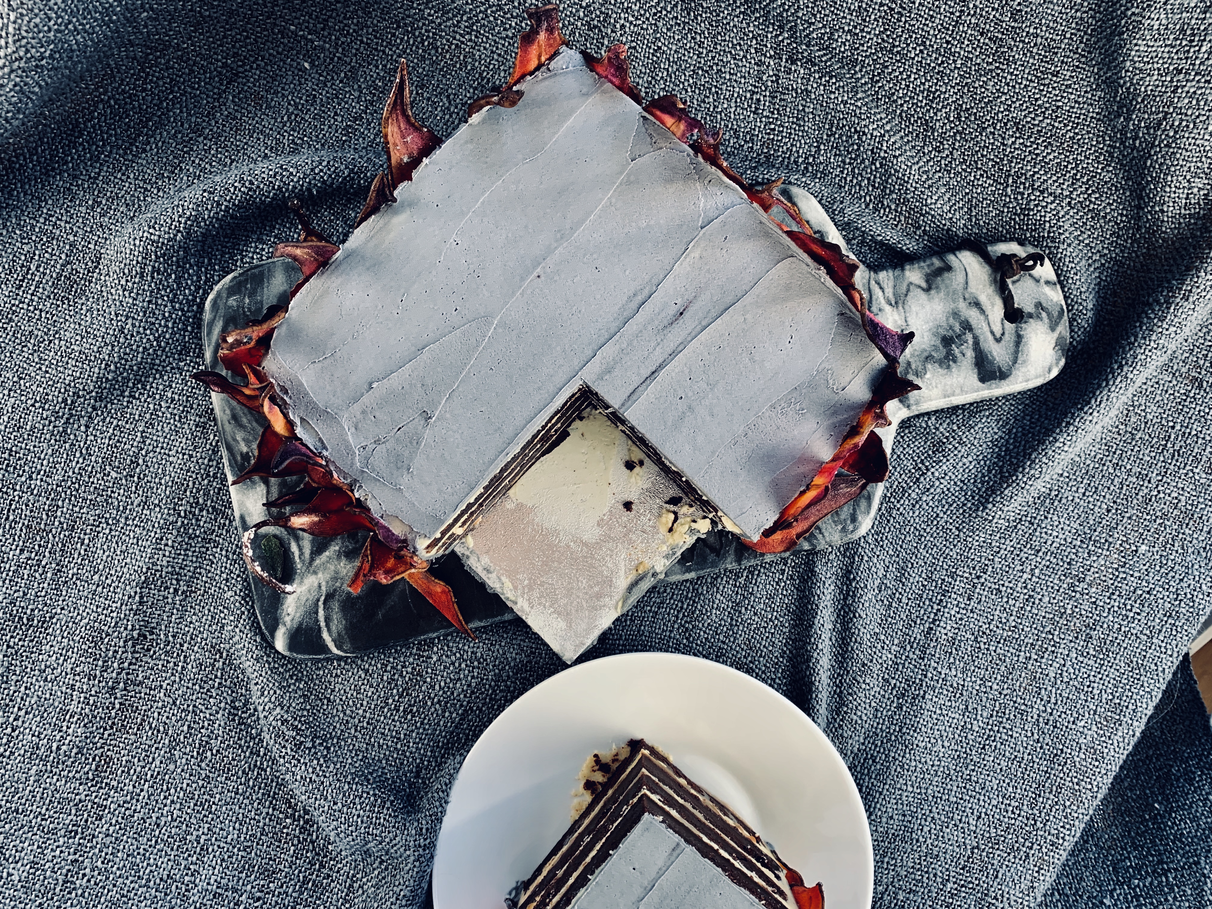 - Divide batter evenly between prepared cake pans lined with parchment paper or baking sheet (if you are baking them in two pans, evenly distribute the batter and then once baked, let them cool completely (VERY IMPORTANT!) and then slice them length wise half way). Bake until a cake tester inserted into centre comes out clean, about 35-40 minutes. Let cool in the cake pan before assembling.