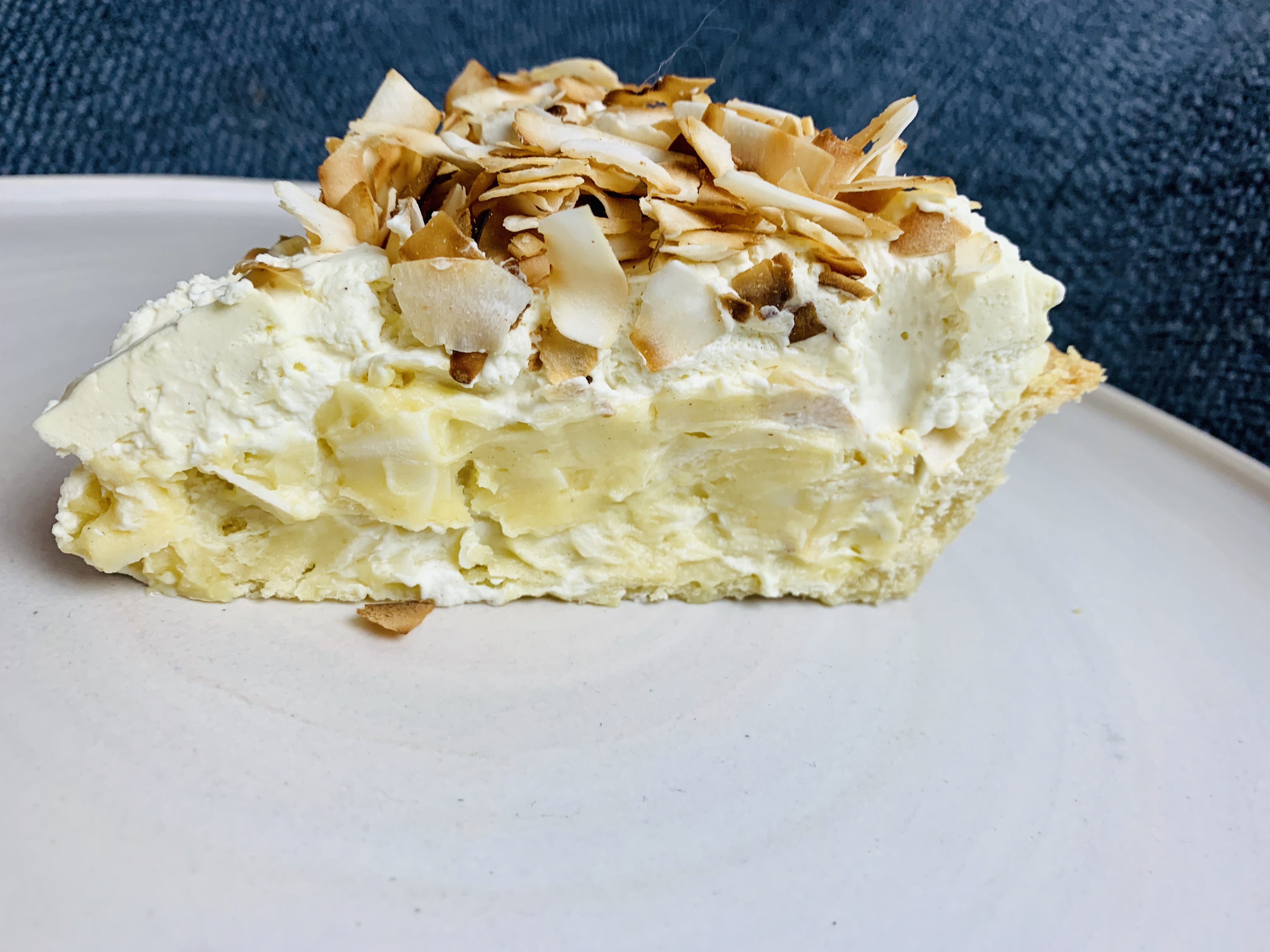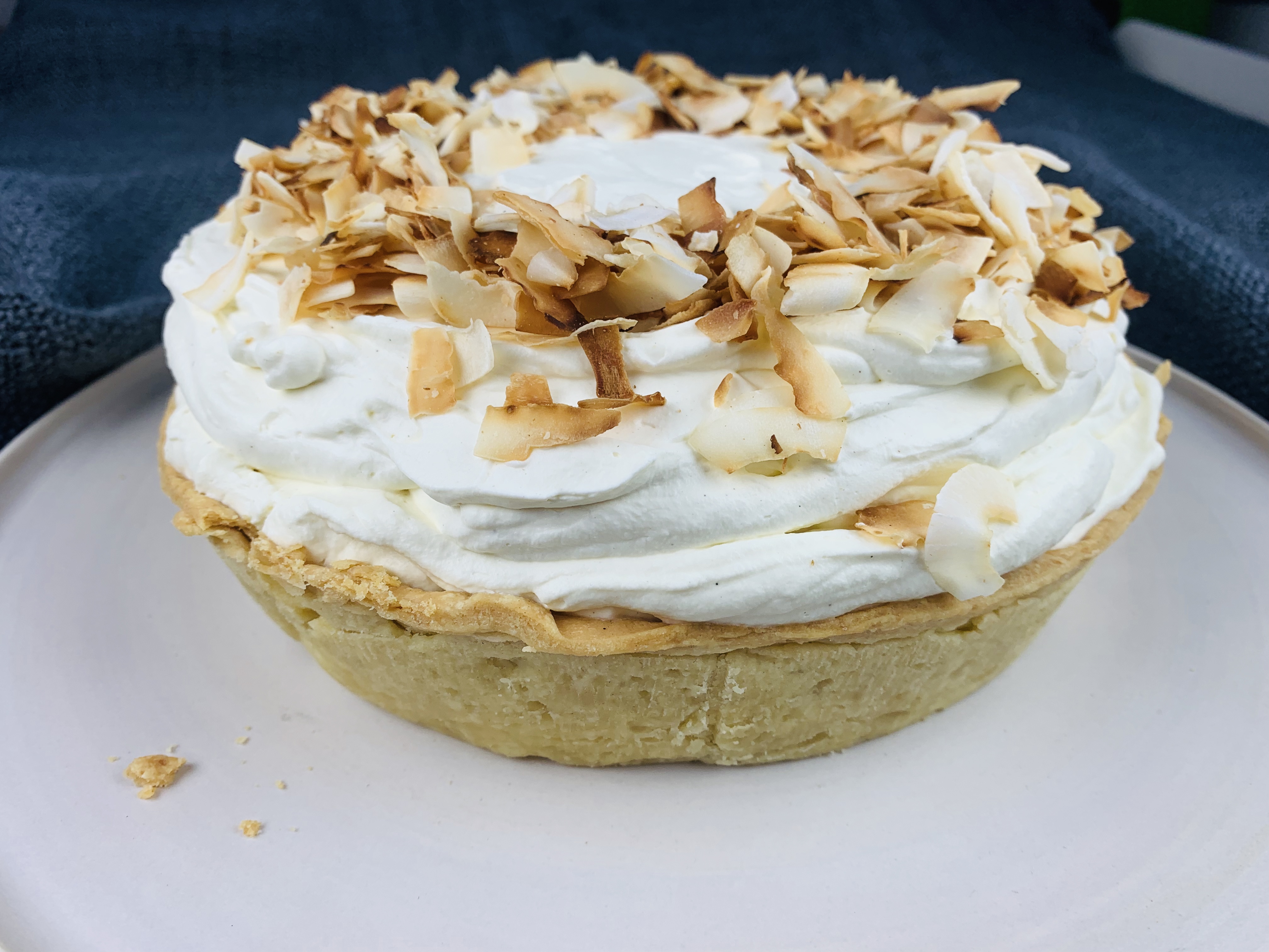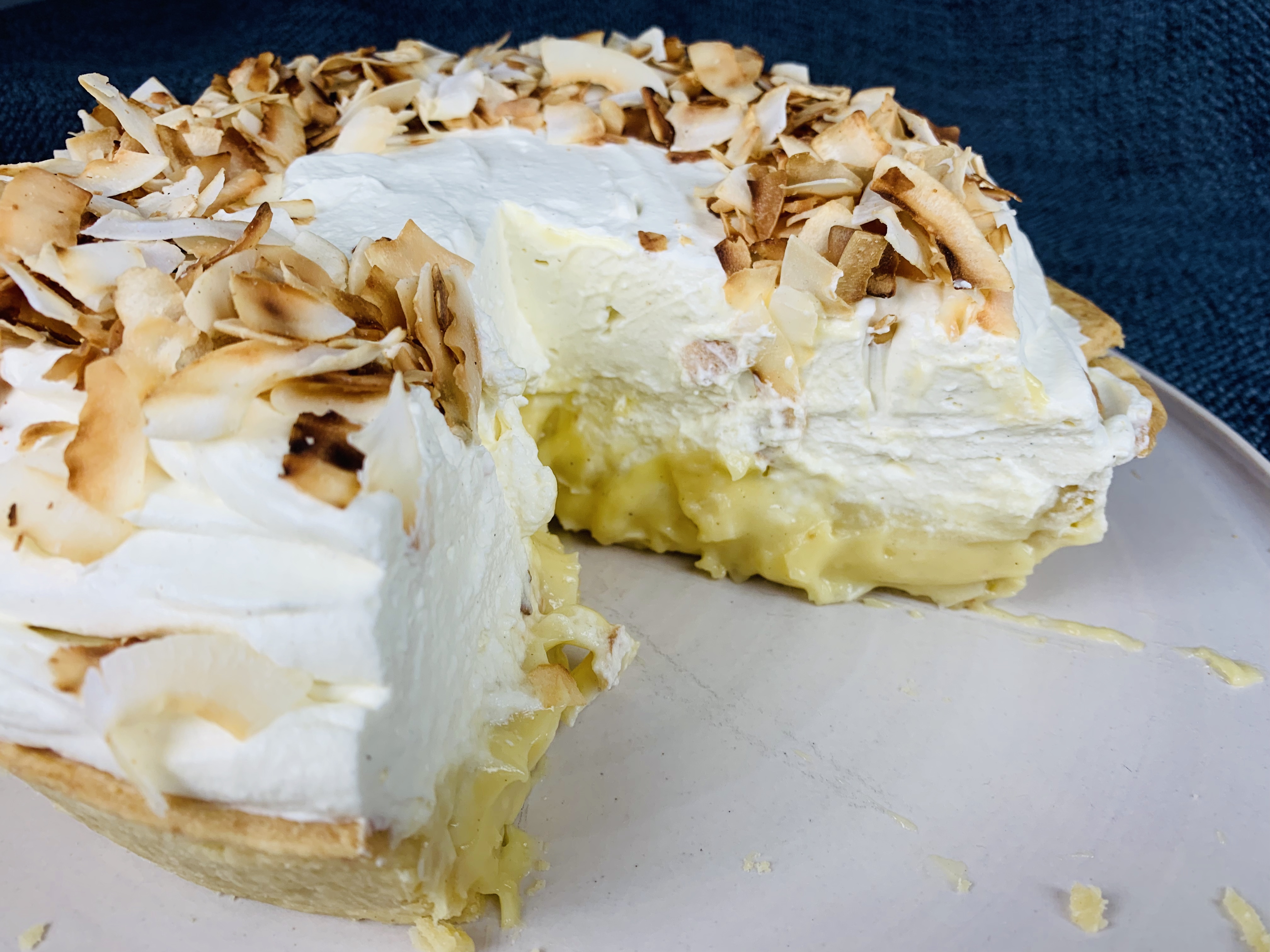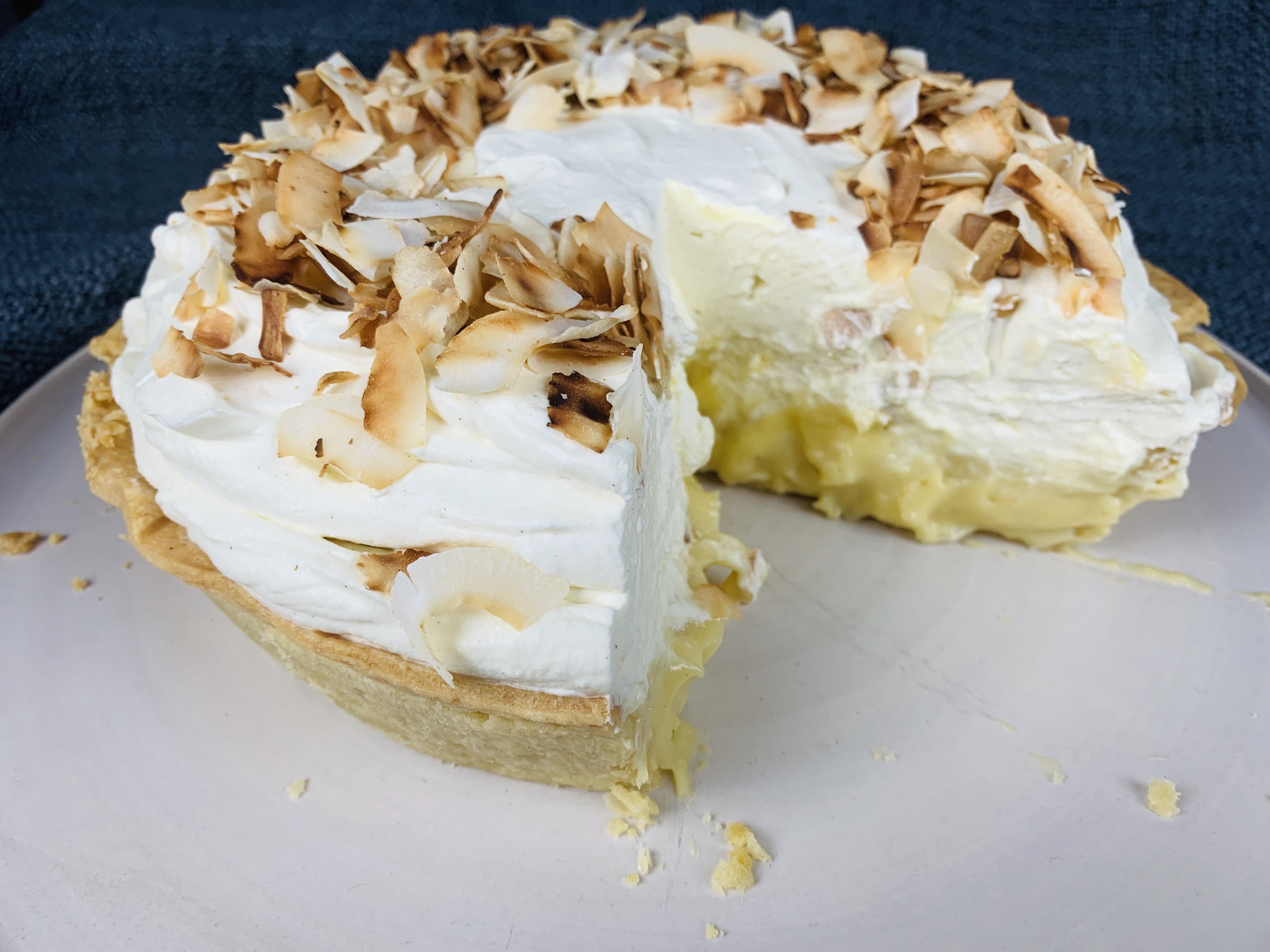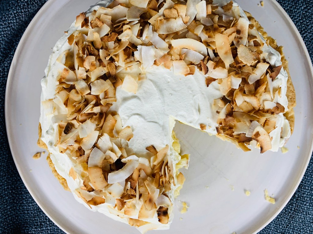 - Once you’re custard is chilled, and slightly firm, but still a bit wobbly, pour it into your ready made pie crust. Top with whipped cream topping and decorate with the remaining toasted coconut flakes. And voila! Your traditional southern coconut cream pie!