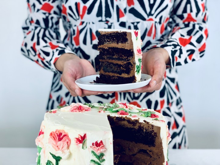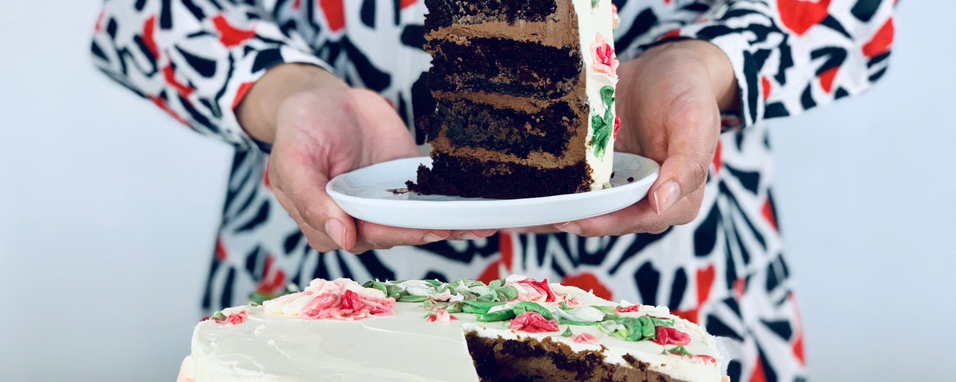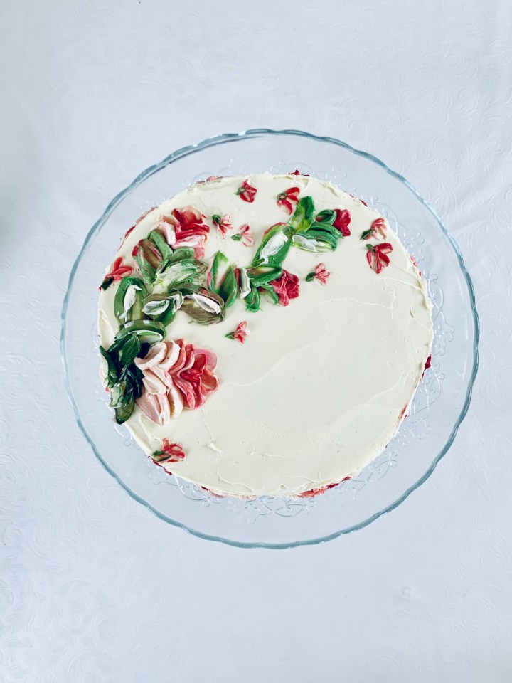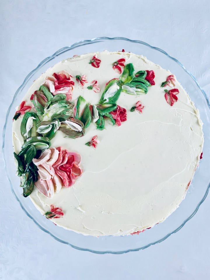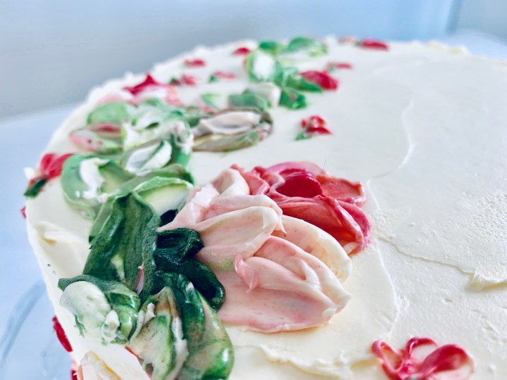 Once the cakes are completely cooled, cut them in half so you end up with four cake layers. Then fill each layer with the coffee Dark Chocolate Swiss Meringue Buttercream (that’s a mouthful to say!) and then coat the outside of the cake as well as this is your crumb coat. Then place in the fridge for about 1 hour. Once hardened a little, take your white Chocolate Swiss Meringue Buttercream and coat the entire cake with it. I mixed some of my white chocolate buttercream with a few extra gel colours and painted some Flowers as a design on the cake, but you are free to decorate as you wish!