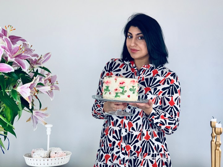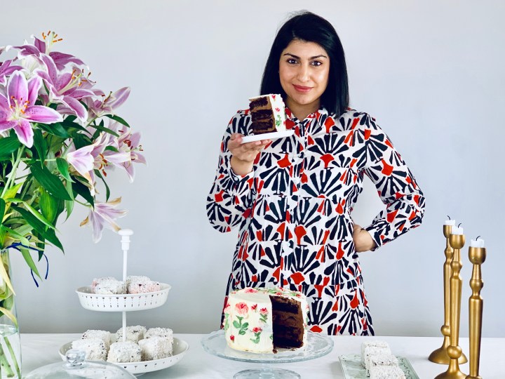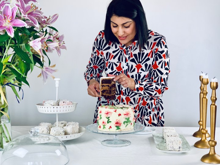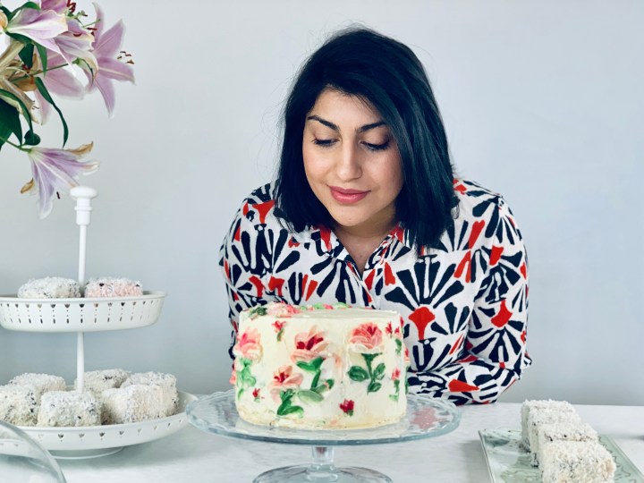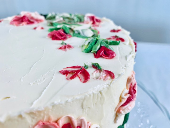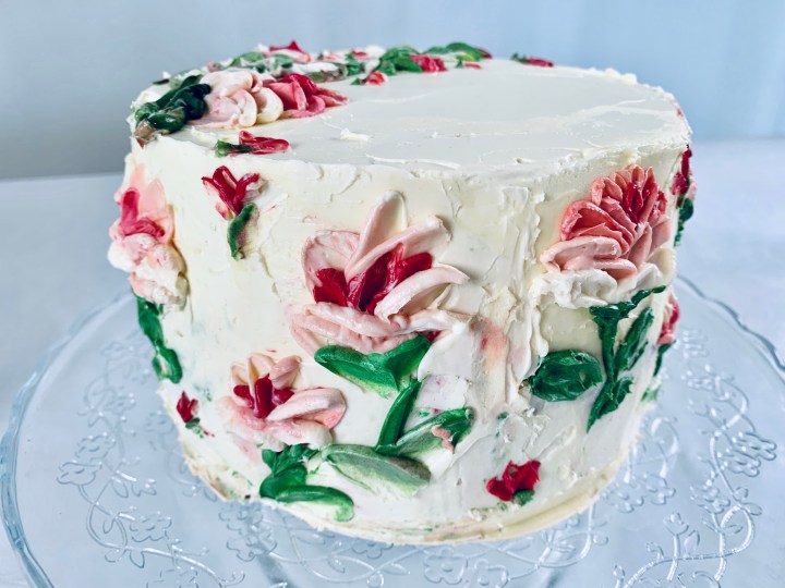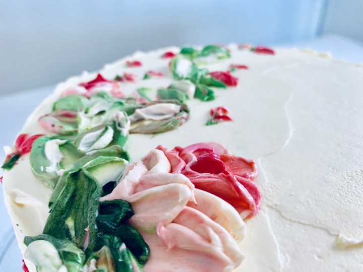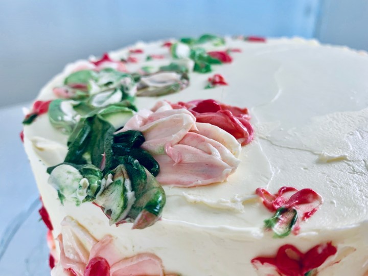 Once the cakes are completely cooled, cut them in half so you end up with four cake layers. Then fill each layer with the coffee Dark Chocolate Swiss Meringue Buttercream (that’s a mouthful to say!) and then coat the outside of the cake as well as this is your crumb coat. Then place in the fridge for about 1 hour. Once hardened a little, take your white Chocolate Swiss Meringue Buttercream and coat the entire cake with it. I mixed some of my white chocolate buttercream with a few extra gel colours and painted some Flowers as a design on the cake, but you are free to decorate as you wish!