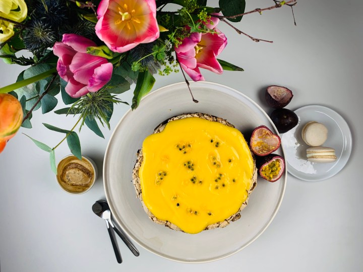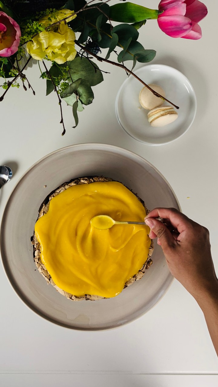 - Pour the passion fruit curd ontop of the merengue layer of the cake and decorate (if you want) with the passion fruit pearls.