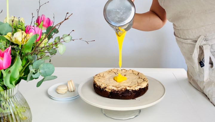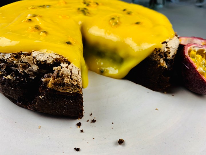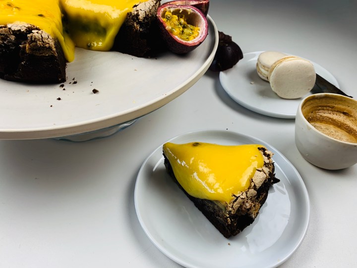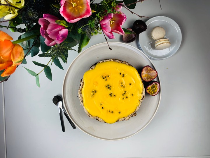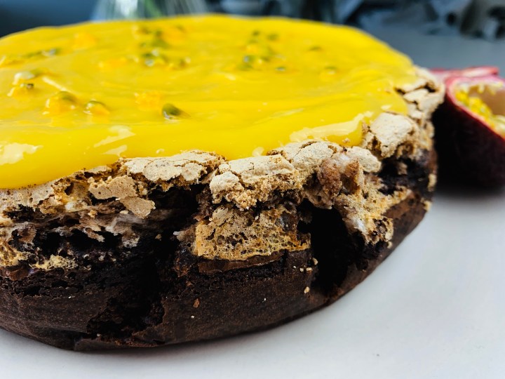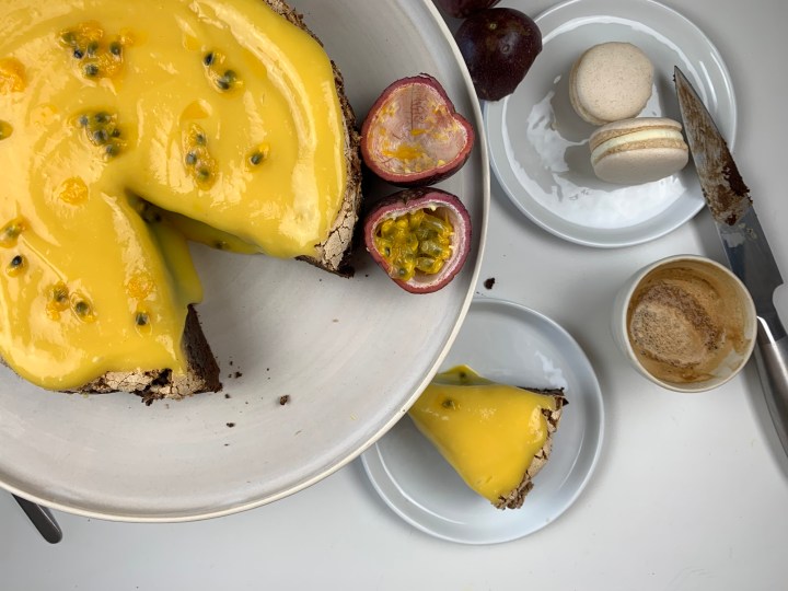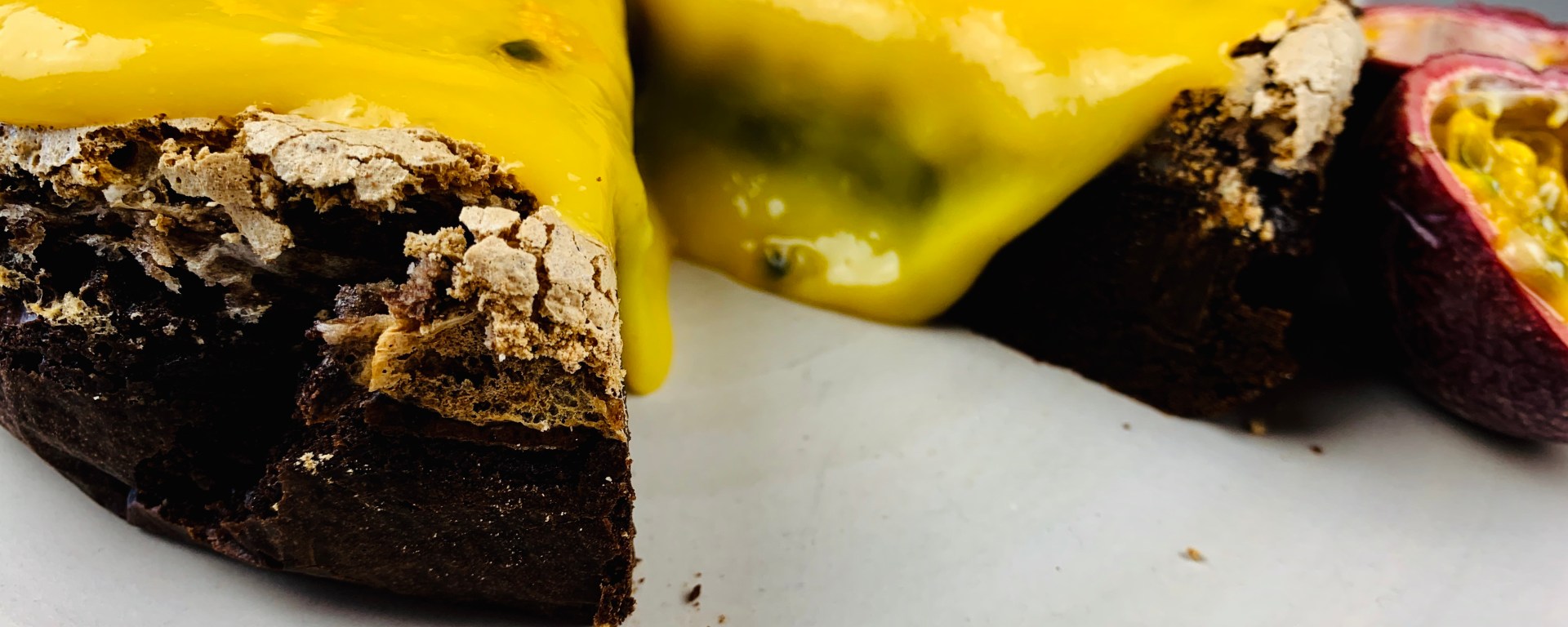 It’s Easter, and although I don’t celebrate it many of my close friends and family do. And therefor I baked a very suited cake 😉 A twice baked (yes twice baked! But not dry very chewy and yummy!) brownie with a chocolate pavlova meringue and a sour and sweet passion fruit curd. It’s absolutely mouthwatering and with the dark chocolate brownie and the sweet meringue and the sour notes of the passion fruit it’s the perfect combination of flavors and marry so well together!