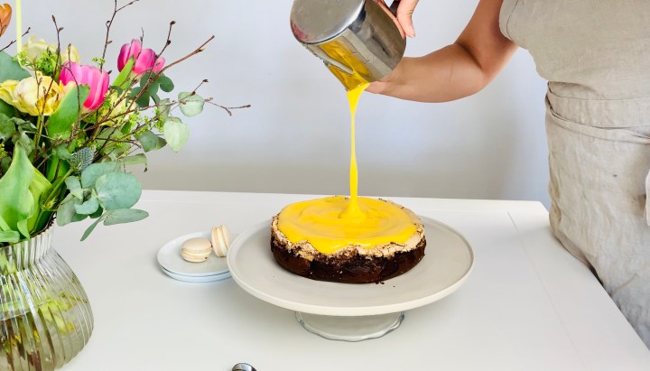 After 20 minutes, remove it from the oven and allow it cool to room temperature before removing the outer ring of the baking tin. Allow it cool completely (another hour or so) before trying to move it onto a cake stand or it will break apart.