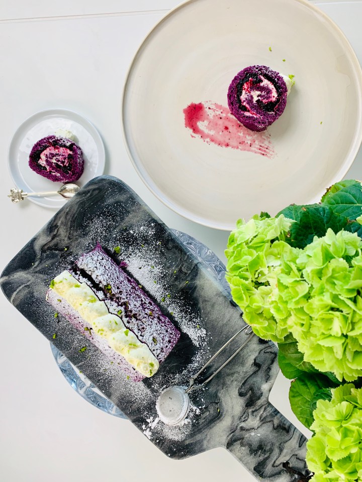 A swiss roll or Rulltårta as we like to call it in Sweden, is a classic. Its a classic for any tea party, or any Fika, or get together. Granny always has one, neighbours always make one. Its just in everyones household as a classic little cake. Now, imagine you do the unspeakable, and change it! LOL well.. in true Ammna-style, thats what I did. I took our beloved sweet little swiss roll classic and made it into a phantasmagoric (yes thats a word) swiss roll. I had some blackberries int he freezer, and just kept wanting to make something with them, so I thought, lets make a swiss roll.. but the actual cake will be blackberries, but wait a minute, it may not taste so much of blackberries so ill add a blackberry jelly inside.. but then i need something to sandwich the two together, so why not a mascarpone lime whip cream!?!?!?! and Voila, the colourful sister of the swiss roll was born! Its easy to make guys, and the jelly is a burst of flavour in your mouth! You will love it, your neighbour will love it, your friends will love and so will your granny! 😉