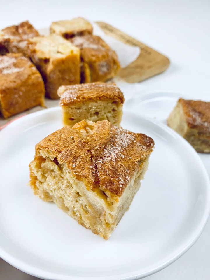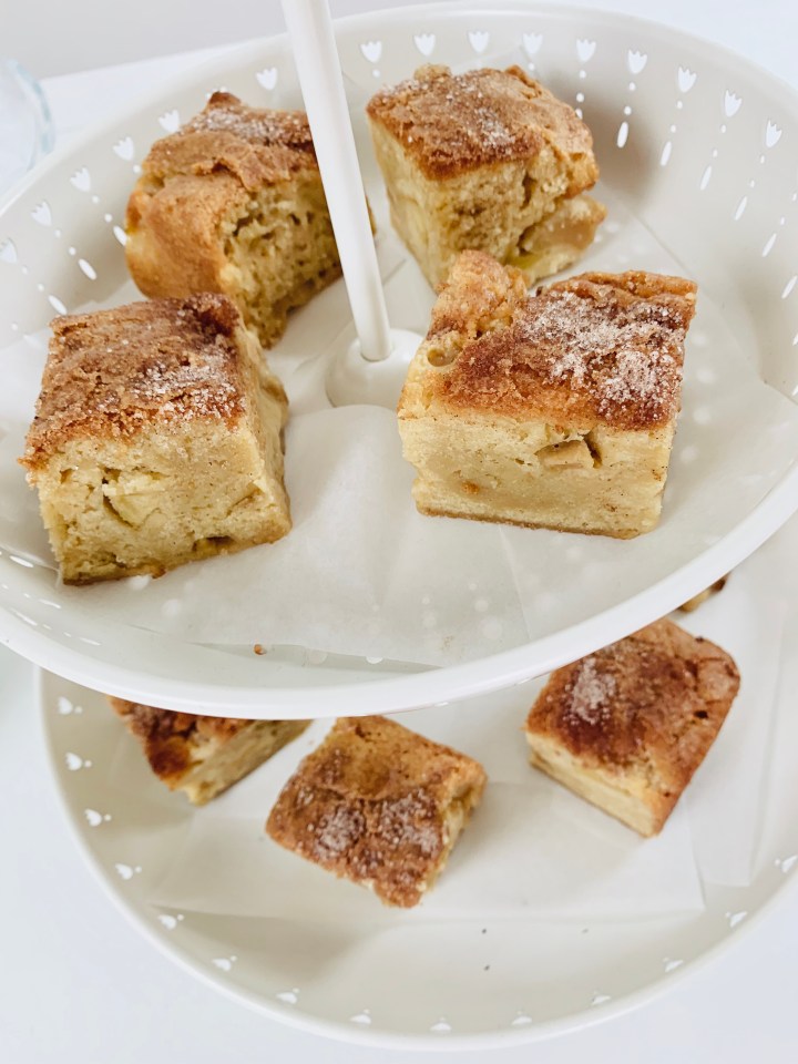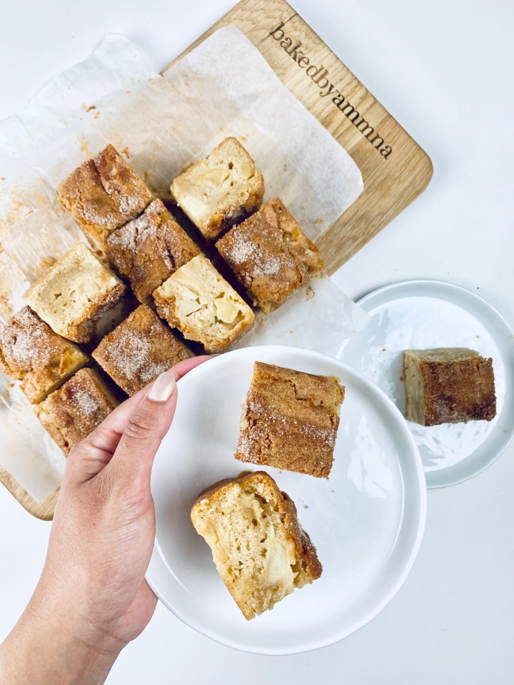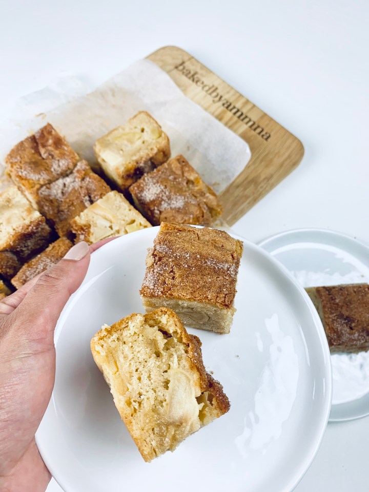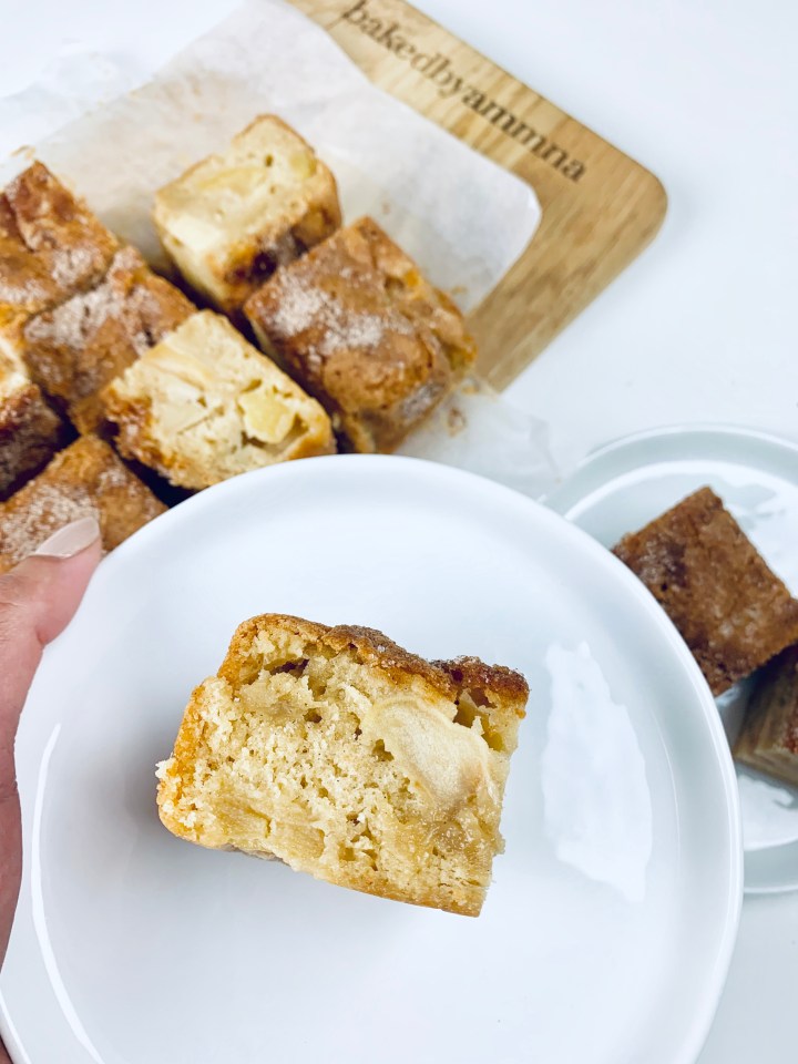 The weather in Sweden just keeps going up and down. It’s June and still the summer hasent hot properly yet. The cool winds keep us close to our cardigans and sweaters… which means one thing… Apple Desserts! Apples are something that when baked have always given me a sense of warmth and cozyness. So as I had some apples lying in my fruit bowl on a windy day like this, I decided to bake Apple Blondies! And as you guys know already from my previous posts, Blondies are Brownies just without the chocolate 😉 These are easy peasy to bake and super delicious!