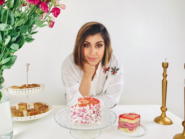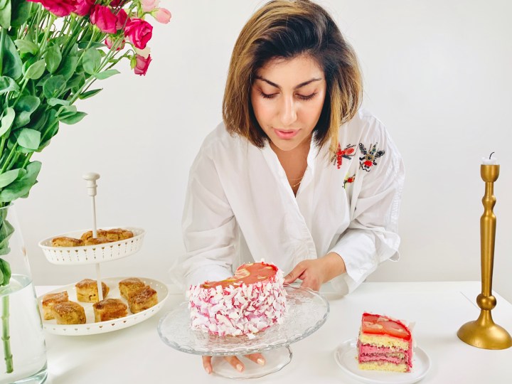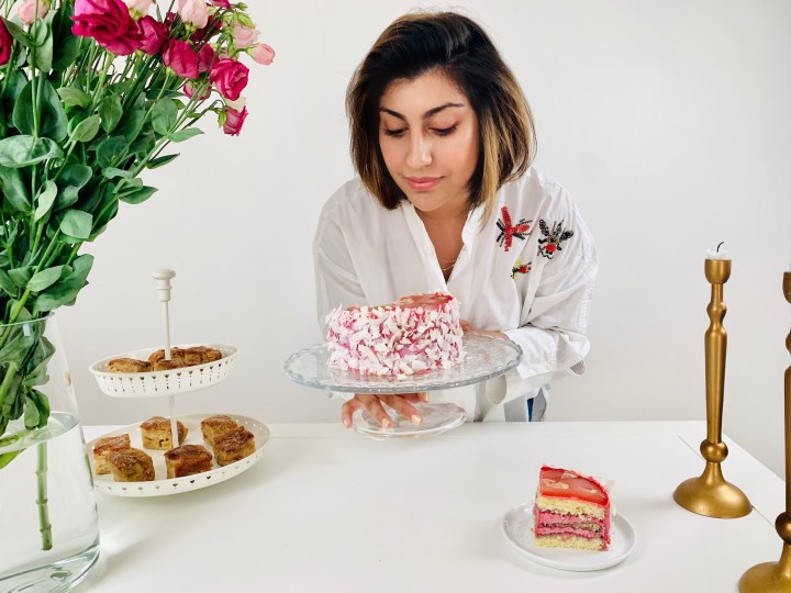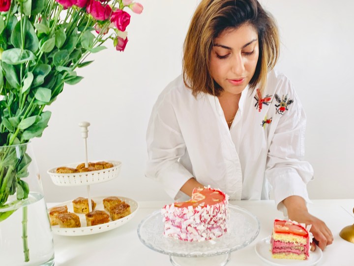 - Once the cakes are cooled, cut them in half so you have four layers. Fill each layer with the raspberry mousse evenly. And spread a very thin layer on the top layer.