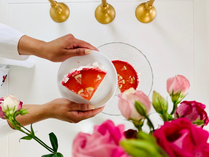 Heat the puree and gelatin in the microwave in 10-second intervals until warm and smooth. Set the mixture aside to cool to room temperature or in the fridge. Note that the colder the mixture gets, the firmer it will be. If you want a more cohesive pink color frosting, you won’t want it to firm up too much before adding to the whipped cream in the next steps, but it should be at least room temperature. The firmer the mixture gets, the chunkier your raspberry mixture will be.