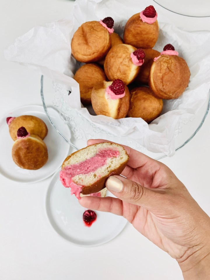 In the USA Today it’s National Donut Day and what better way to celebrate than to make DONUTS!!! My husband isn’t a fan of jam fillings but I love the fruits taste. So I figured if I make a mousse filling he might actually eat it! And guess what! ITS WORKED! I made a raspberry mousse only because I love the tartness of the raspberries and always think that goes so well with the sweet donut. 🙂 it’s take a little time to make but it’s well worth it!