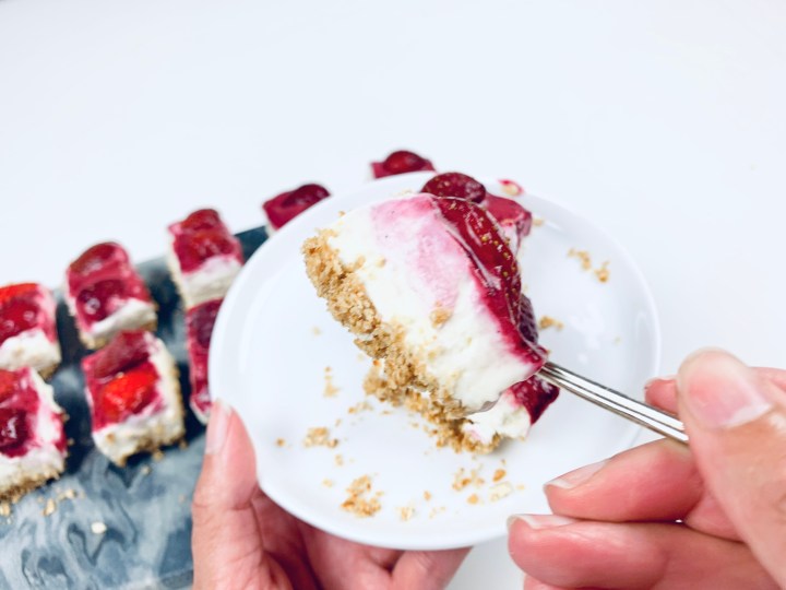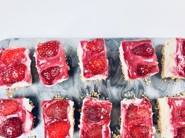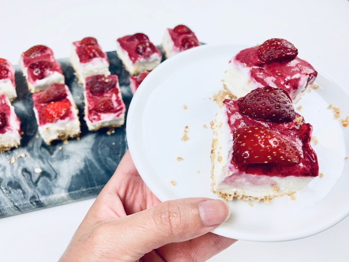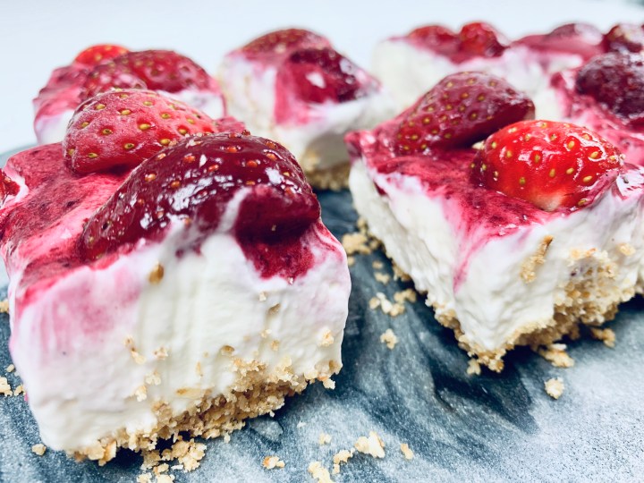 - Once set, take the cheesecake out by pulling the hanging baking sheet on the sides. Pull the cheesecake out and then cut into small equal squares. Serve with the remaining coulis sauce if you wish.