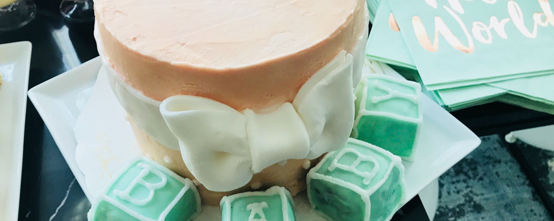 A baby shower is so special. It would only be right to have an extra special cake for this beautiful event. That is why I’m going to share with y’all how I made my special 4 layer 6″ cake (which can feed up to 25-30 people, no joke, it may look small but it is definitely filling!). This cake has lemon chiffon cake, sandwiched with moist dark chocolate cake and lemon Swiss merengue buttercream on the inside. Can I hear a YUM! 😉 Be patient with the cake, it takes some time to make, but it is definitely worth it!