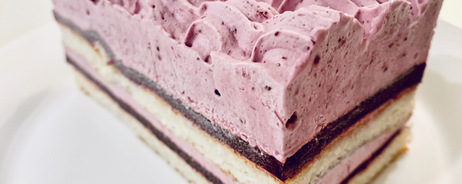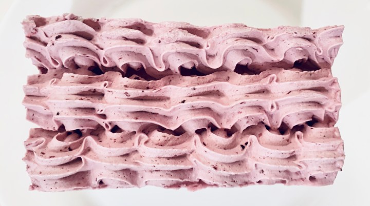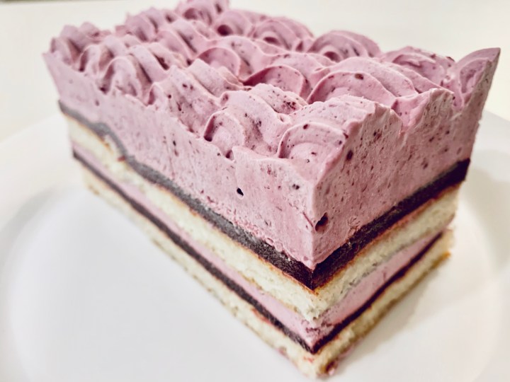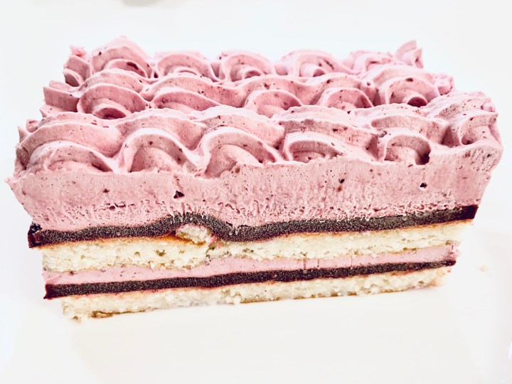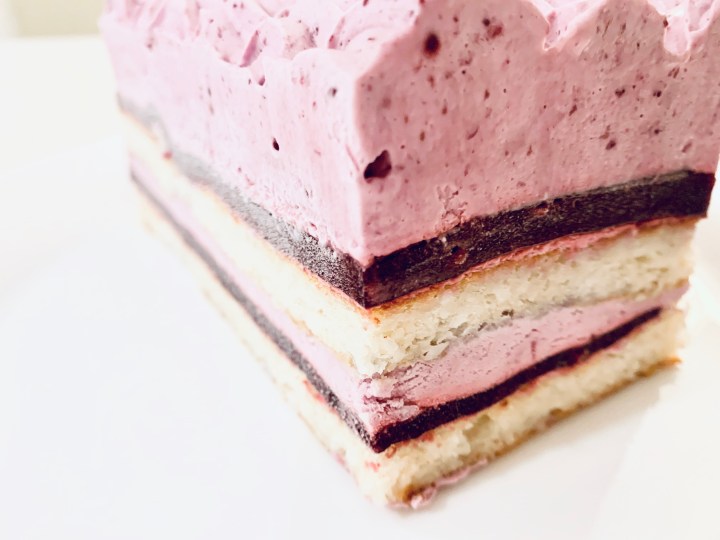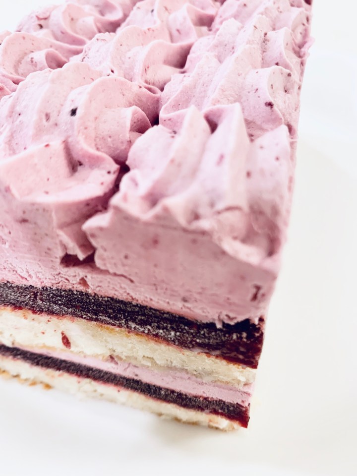 - Grab your lined bread pans and start by piping 2 cm thick berry mousse. Then add one layer of berry Jelly, then place a layer of the coconut Dacqouise ontop. Pipe the berry mousse again (about 2cm) and then place a layer of jelly and then the coconut Dacqouise. Repeat this for the second bread pan as well.