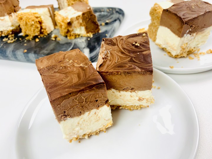 - Pour the cheesecake filling into the cake tin ontop of the white Chocolate Cheesecake and use an offset spatula to smooth out the top.