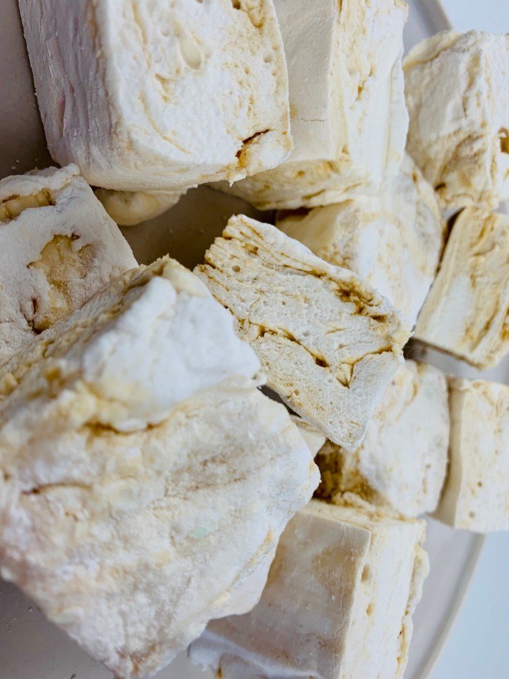 - Working quickly, transfer roughly half the mixture to the second bowl. Whisk in 1/2 of the salted caramel into one of the bowls. Alternate dollops of the mallow mixtures into the lined dish and use the end of your spoon or spatula to swirl together. Drizzle over the top of the marshmallow the remaining salted caramel and then with the back of a spoon or a cake tester, swirls the caramel around to make a pattern. Leave to set (not in the fridge) for a few hours until firm.