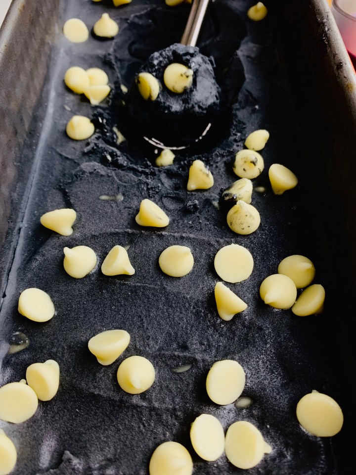 3. Once fully churned and ready, take out, place into a tin, or bowl (I used a bread tin, just because I think it looks nice) And then working very quickly (as the ice cream is super soft and can melt easily at this point), pour in the white chocolate and swirl them around the entire batch of ice cream with a spoon until you’re comfortable that all chocolate is evenly distributed. Add a few chocolate pieces on top and place into freezer for an hour – or until you can wait anymore.
