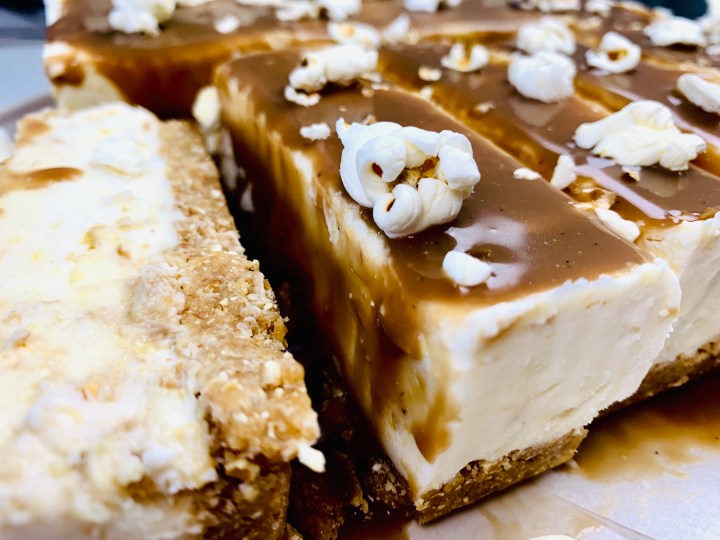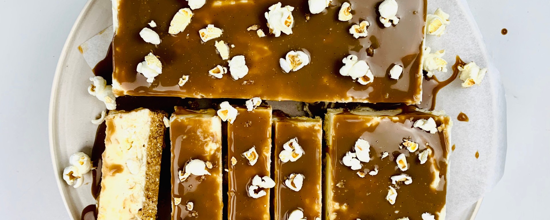 Once set, pour your salted caramel sauce over the top, add some popcorn , and voila! Your cheesecake is ready to be eaten and loved by everyone!!! 🙂