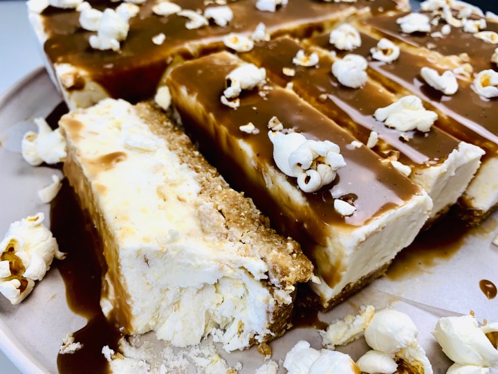 - Take your popcorn, and using the food processor again, whisk until it resembles large grains – don’t make it into a powder too much, otherwise there wont be a popcorn texture in the cheesecake.