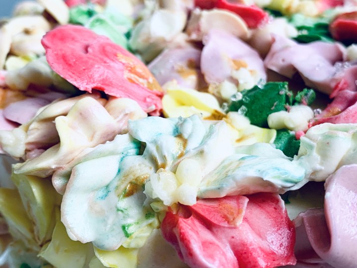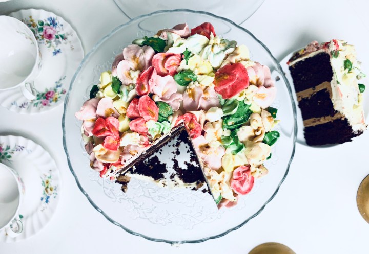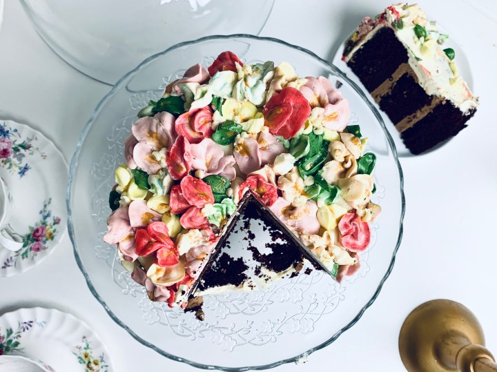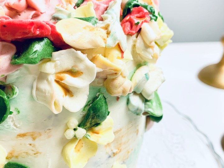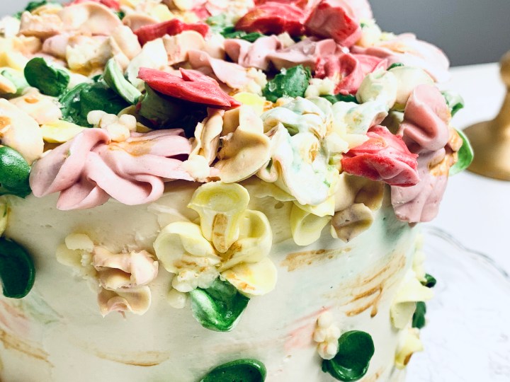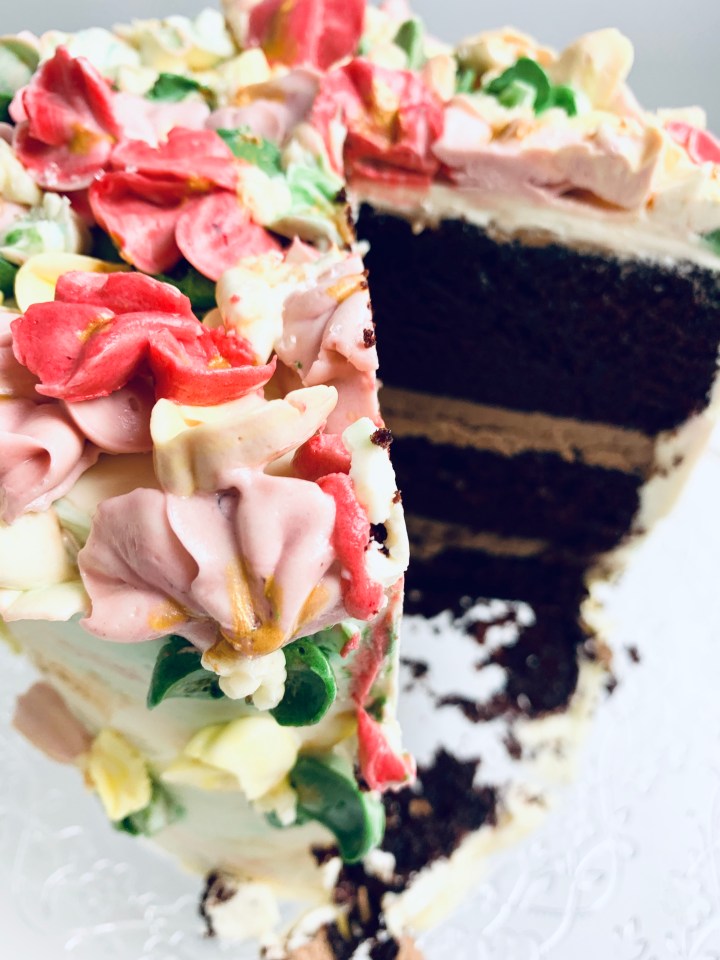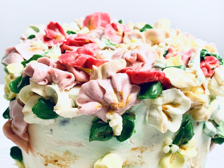 - Decorate as you wish, or of you would like to make the flowers, make a 1/2 batch more of the same white chocolate buttercream, and split them into separate bowls, adding your desired colours into each bowl. Blend them thoroughly and then get piping away! 🙂
