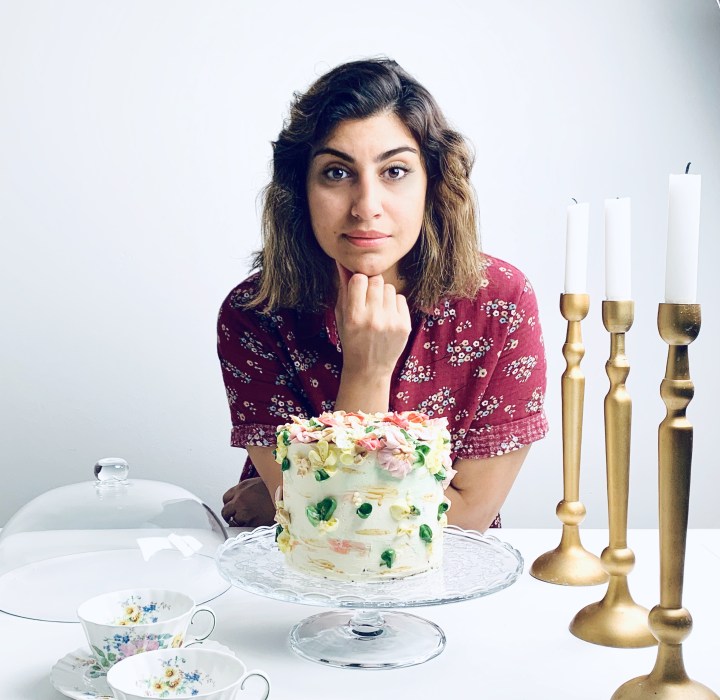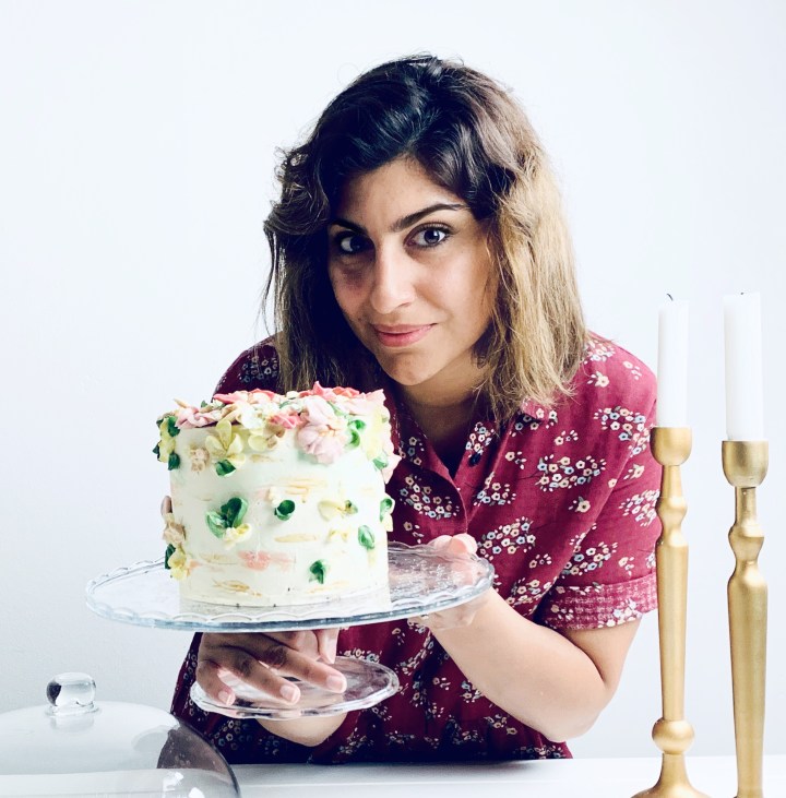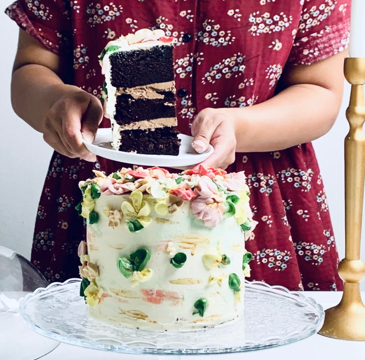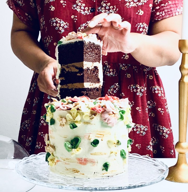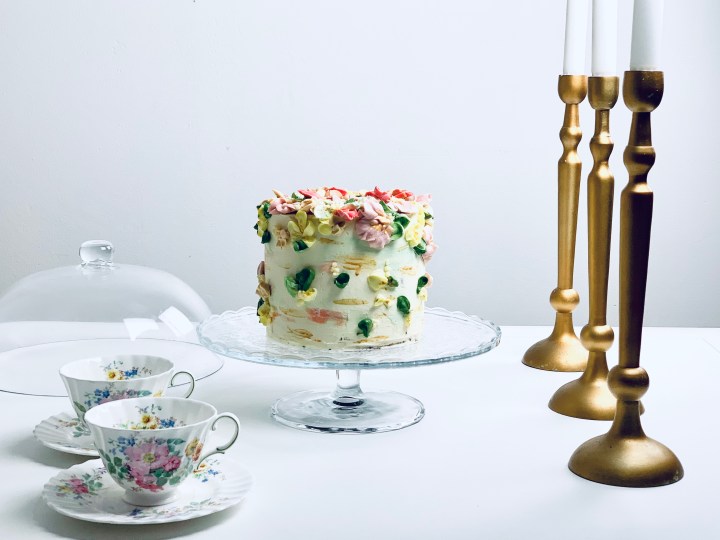 - Take your cake out of the fridge, and cover with the white chocolate swiss meringue buttercream.