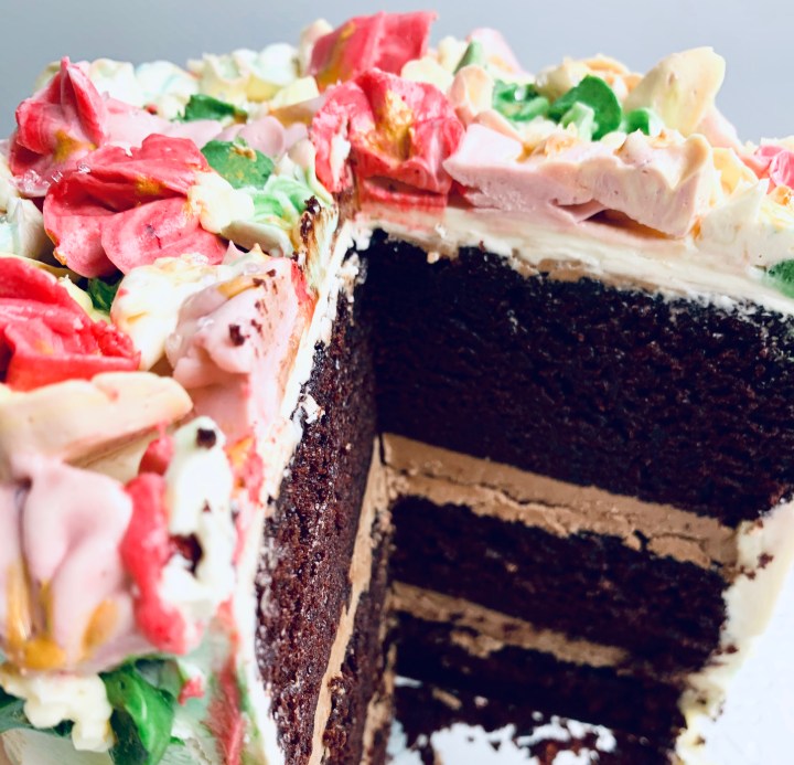 White Chocolate Swiss Meringue Buttercream – (outside layer & flowers)