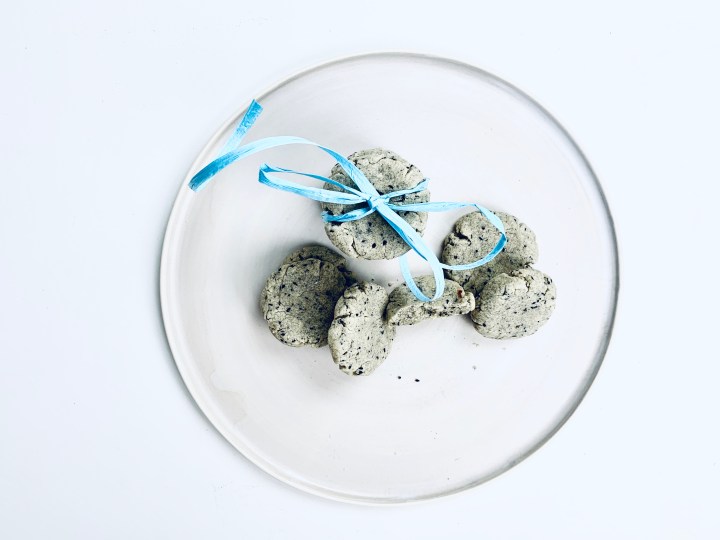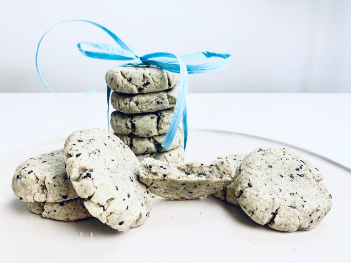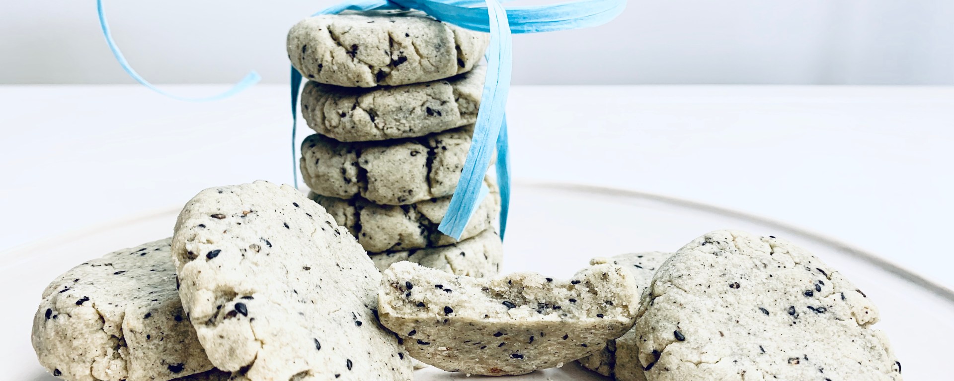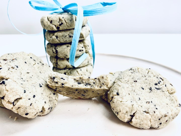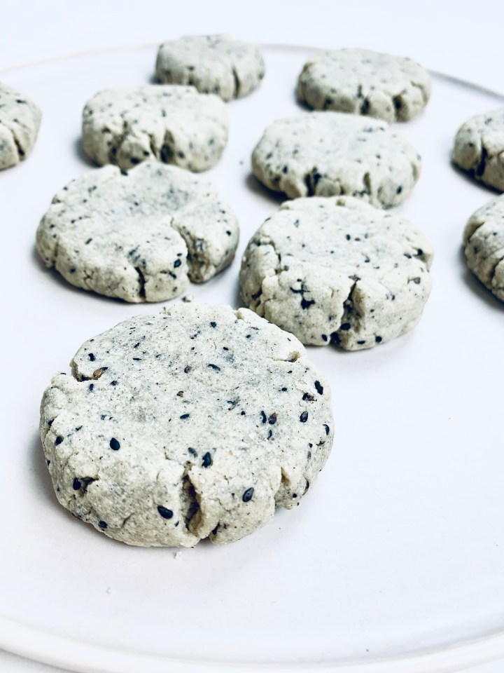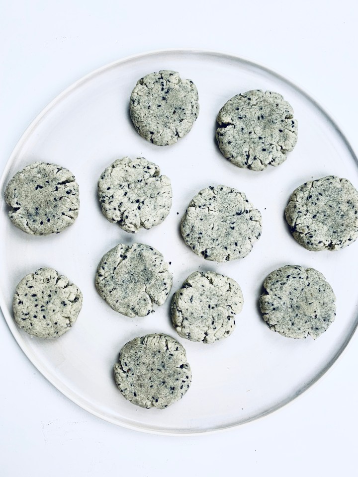 So there is a new trend around, and its the Black Sesame! Many make black tahini with it and then use it in various ways, but I decided to stick to the natural seed flavour and see how it goes. Mind you this isn’t for everyones liking. You either like it or you really really don’t! I loved it, my husband really didn’t! ha! But when I took it into work, 7 out of 8 loved it! So therefor I decided the recipe goes on the blog! 😀 its a quick no fuss recipe, literally put everything in a bowl, and mix, then shape the cookie dough balls and bake! No fuss, and a very unique yummy taste afterwards!