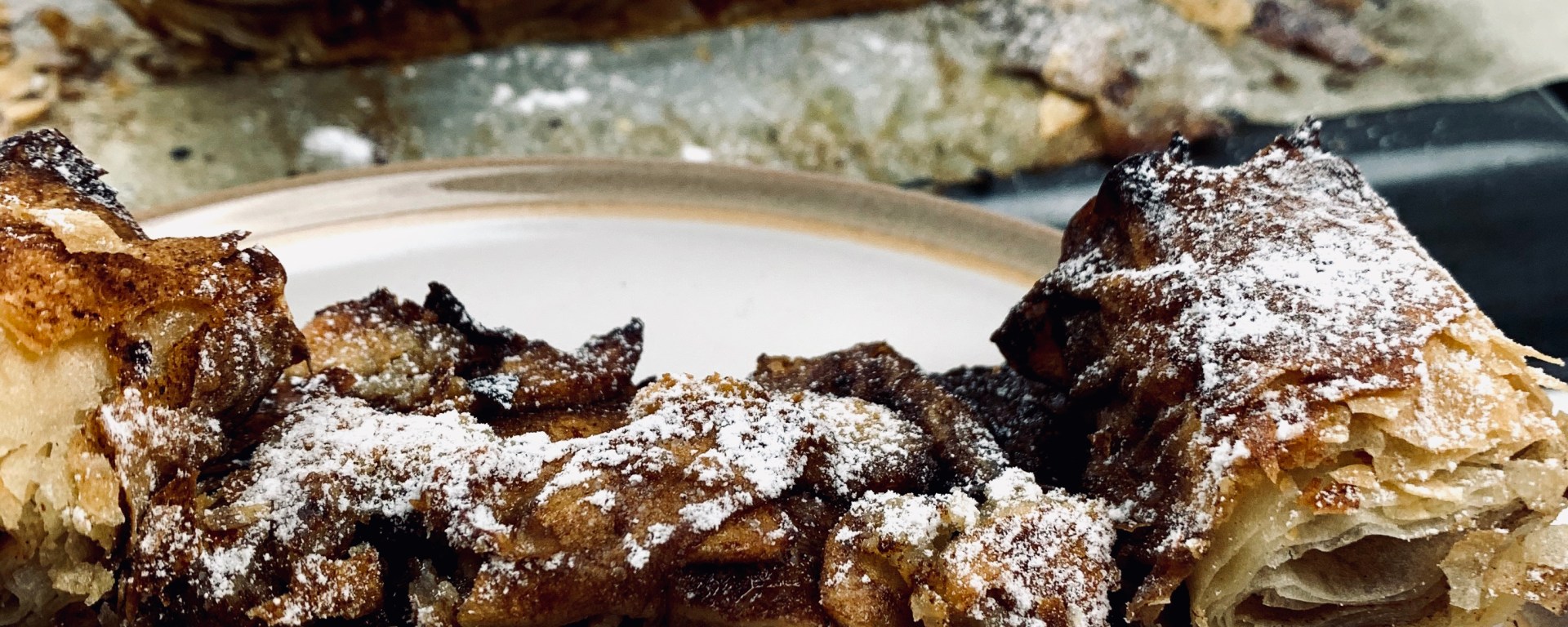 8. Remove from oven and let cool in sheet pan. To garnish, sprinkle apple strudel with icing sugar. Slice, serve and Enjoy! 🙂