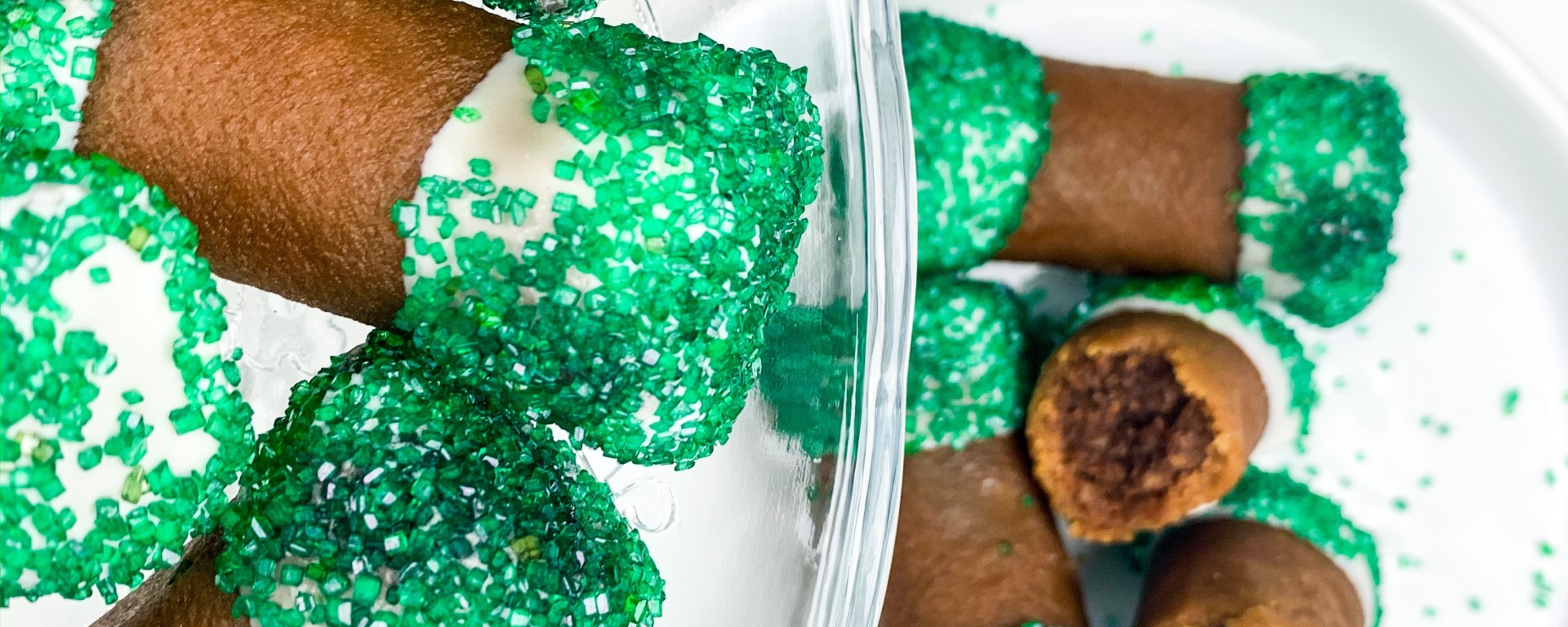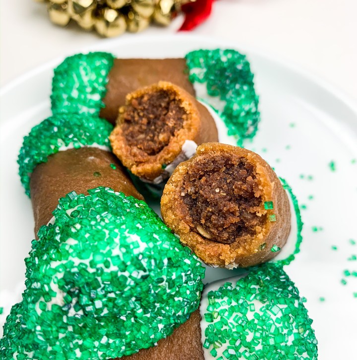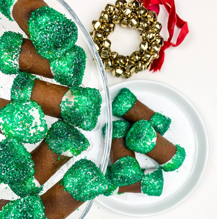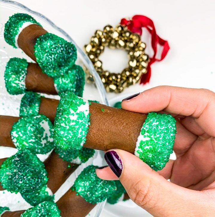 Grab your melted white chocolate and dip both ends of the log into the white chocolate (this acts like a ‘seal’) decorate with some sprinkles (I used green) and let it set on a weird rack. Repeat with all.