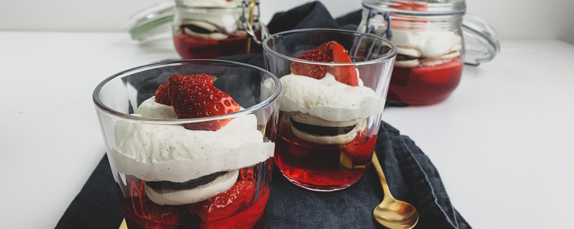 So as the Hallmark Holiday – Valentines Day is creeping up on us.. I thought it would be best suited that I bake something extravagant. I am not a V-day person to be honest, never really understood it, because I love my loved ones and appreciate them all year round, not just one day.. However.. that being said .. I do know and understand many people that do celebrate it and do big things. For me.. I NEVER need an excuse for an extravagant dessert.. hehe so here is what I would call extravagant… Make it in small pots, glass, or a big trifle bowl.. your choice.. but as there are only two of us at home, and I bake all the time and need my husband and myself to watch our weights.. I decided to go with glass/pots. This isn’t your traditional trifle.. there is no cake! Yes I know.. how is it a trifle then.. well in my eyes anything layered with some sort of cream and jelly becomes a trifle.. I’m probably totally wrong.. but whatevs.. 🙂 My trifle starts with a strawberry jelly with sliced strawberries in, with macarons with dark chocolate ganache as filling on top, and then the final touch of mascarpone whip cream on top.. Its literally AMAZING!