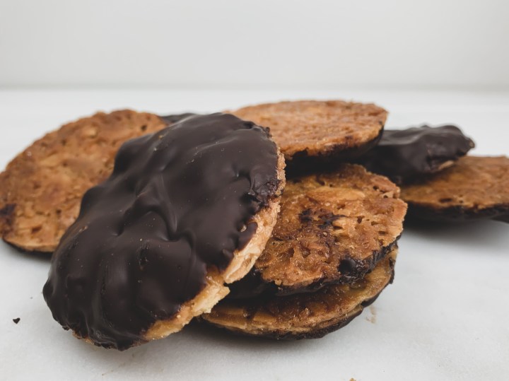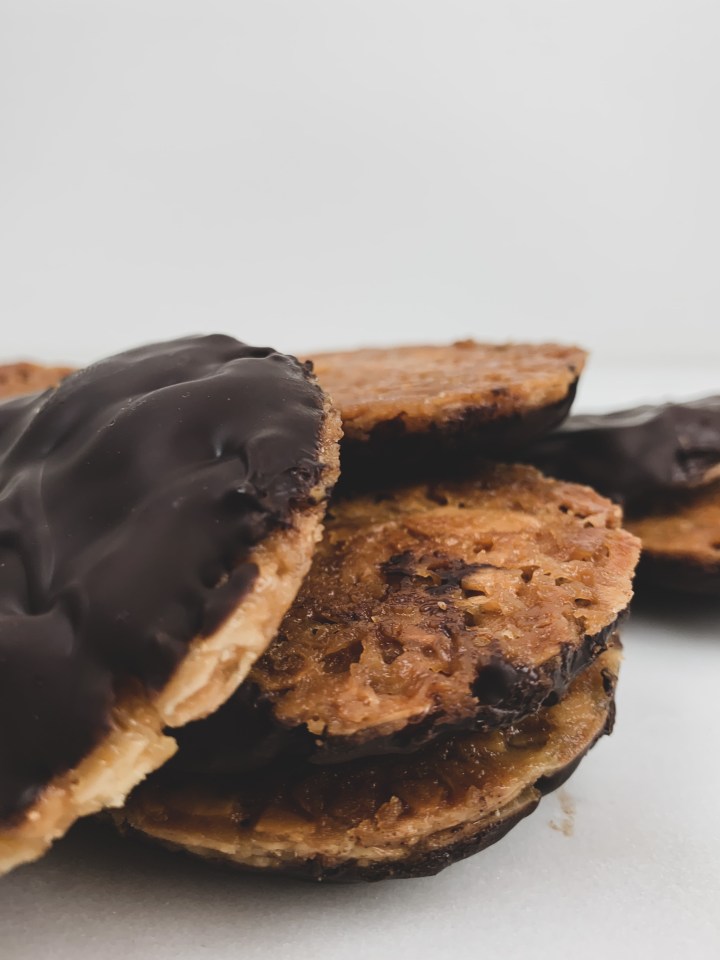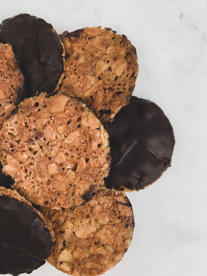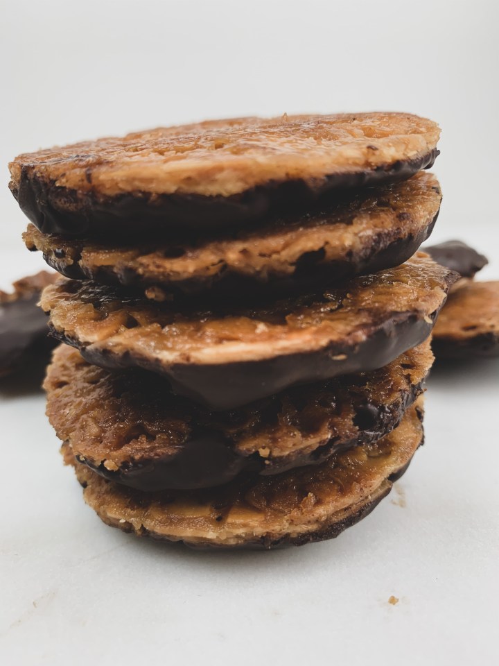 - Melt your chocolate or you could temper it (up to you) and then spread a little melted chocolate over one side of the Florentine and leave to cool with chocolate side up on a cooling rack. And voila! Your cookies are ready! ENJOY!