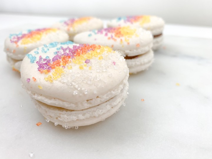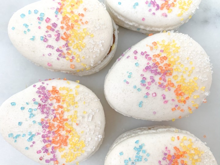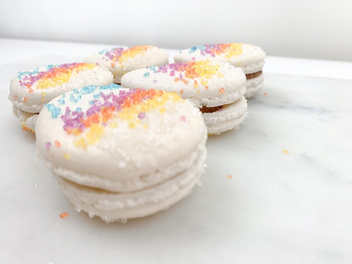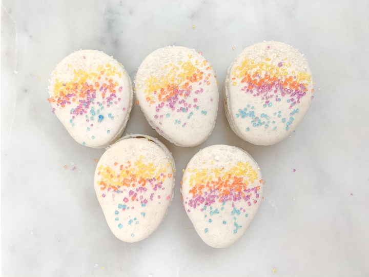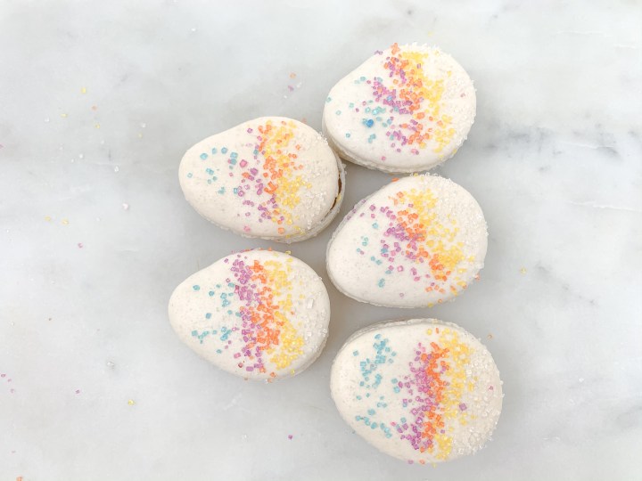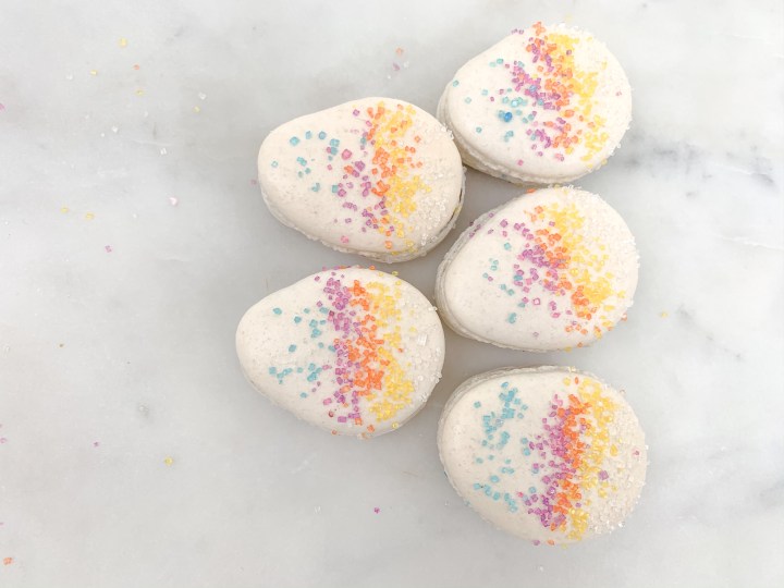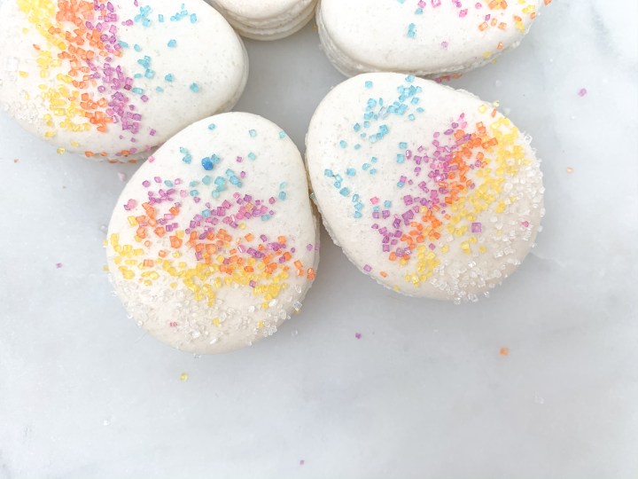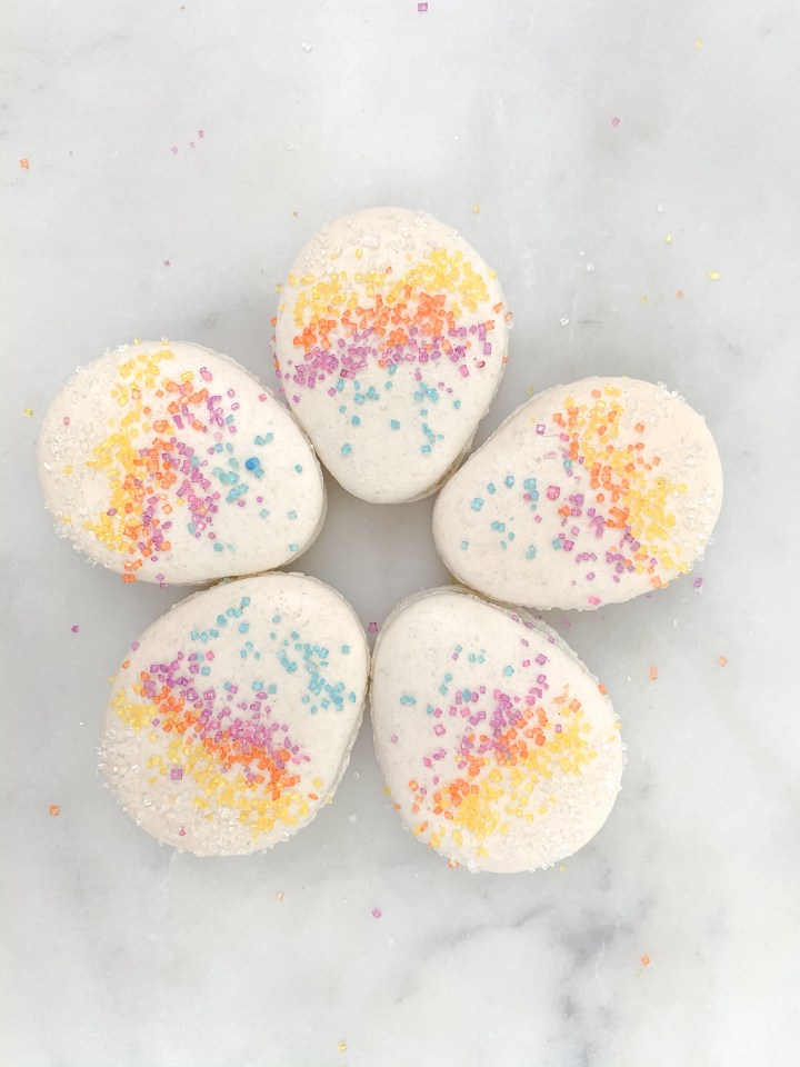 - Leave them to rest for 30 min. Turn the oven on to 140C (300F). Once rested, sprinkle your favourite sprinkles (if you are using sprinkles) on the macarons carefully, dont press or push them in, they will stick themselves.