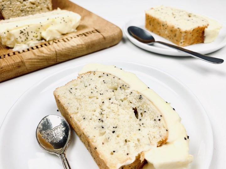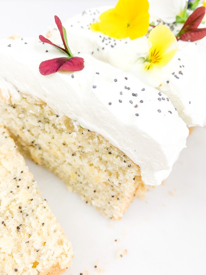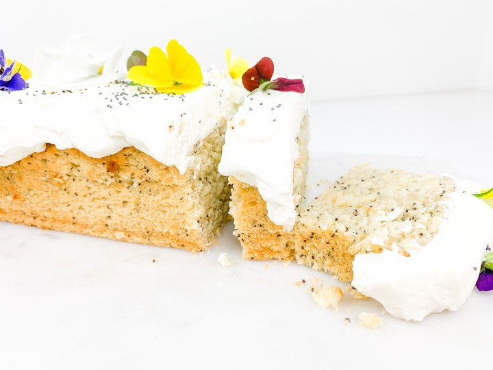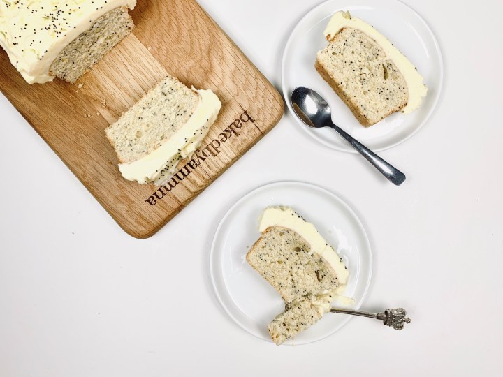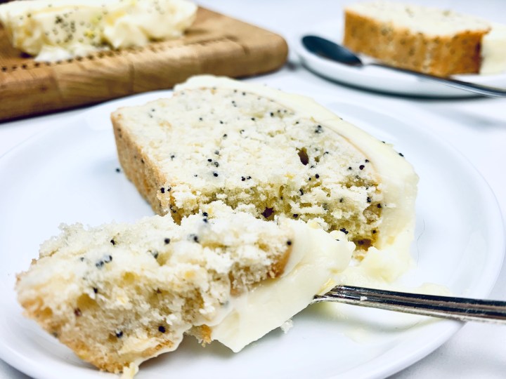 During the summer, you want to have something a Little bit tangy and sweet but nothing to overpowering. You don’t want a full cake but you want something substantial like a cake… right? So here is my take on a cake that’s not so much like a cake but it is like cake … you with me? 😉 My Lemon & Poppy seed butter laof cake is buttery, soft, sweet and a little tart.. topped with a lemon cream cheese frosting, which is to die for! Its extremely easy!