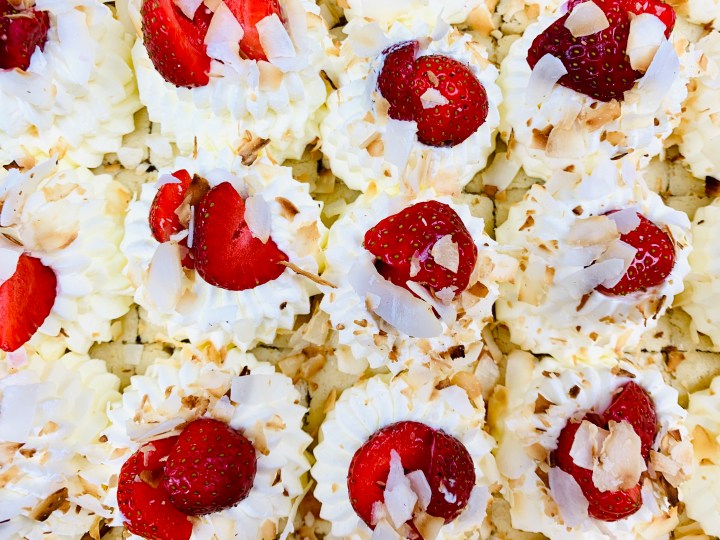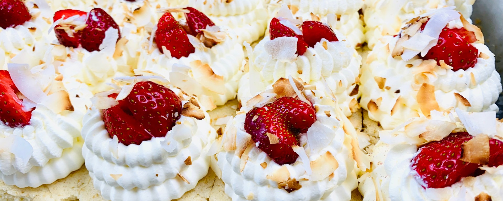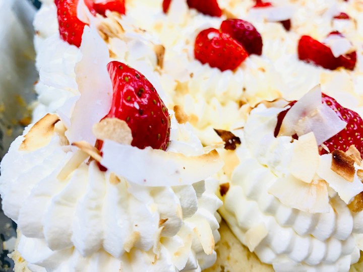 - You can eat it like this or as I have done, garnish with some piped whipped cream, toasted coconut shavings and some sliced strawberries!!!