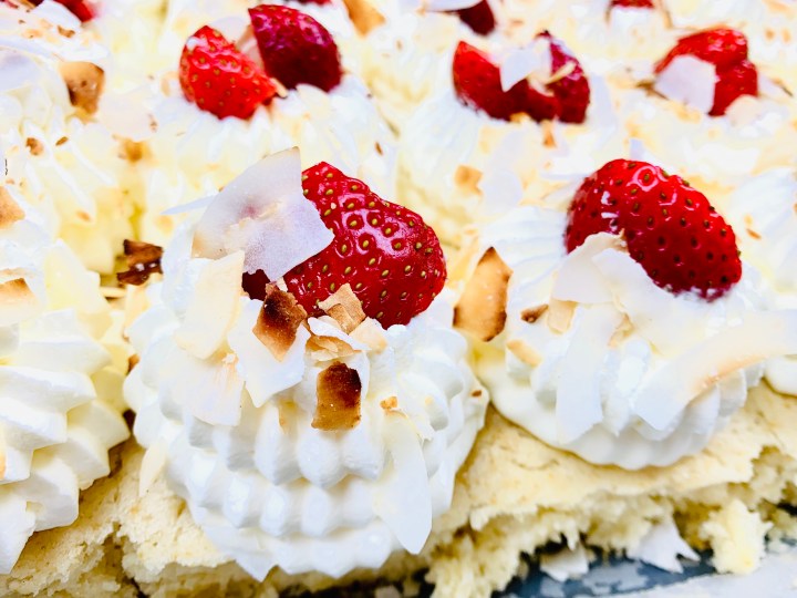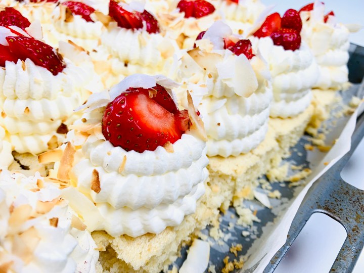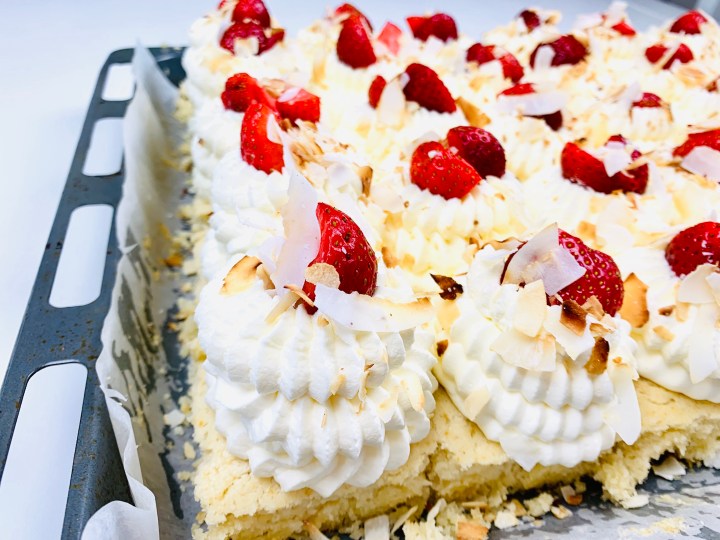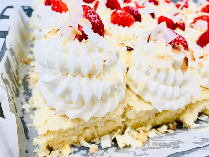 There is nothing that says summer than coconut and strawberries!!! So why not try out my EXTREMELY simple and very very moist & fluffy coconut sheet cake! It’s amazing for parties and gatherings. You get a good amount of servings from it, plus both kids and adults love it!