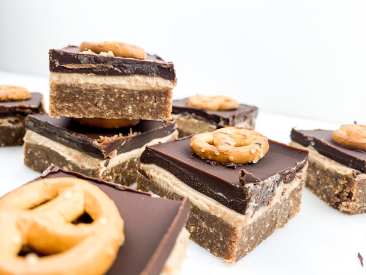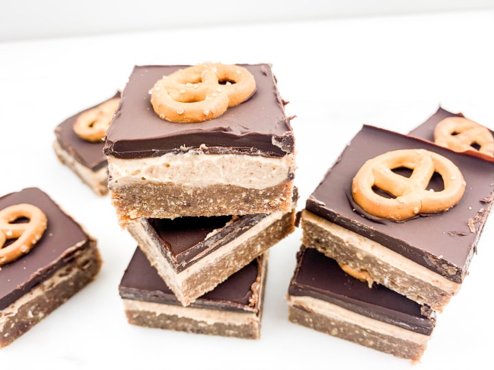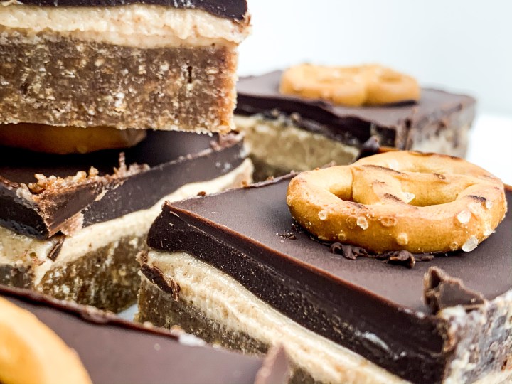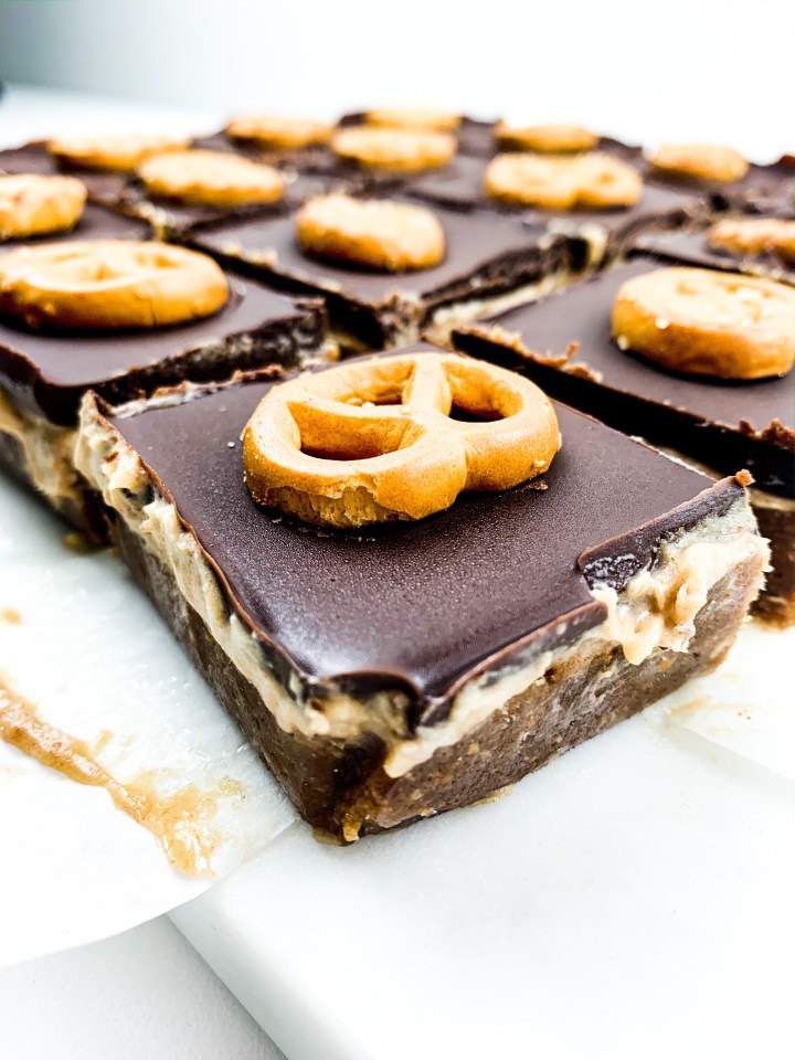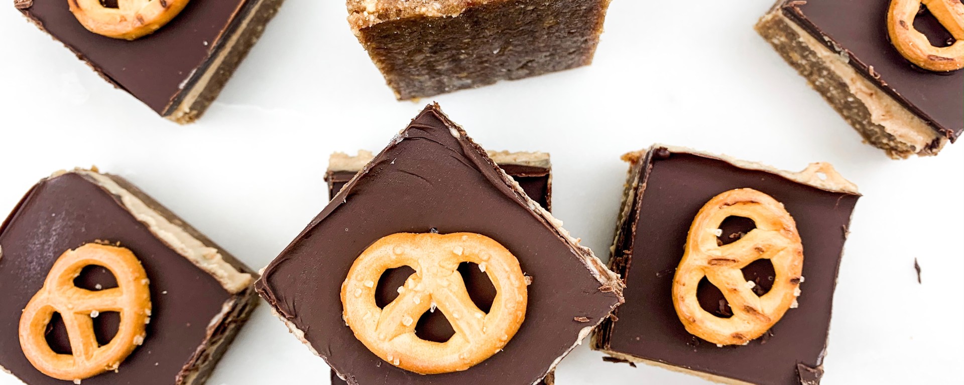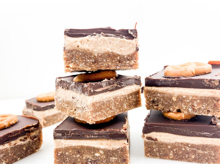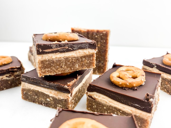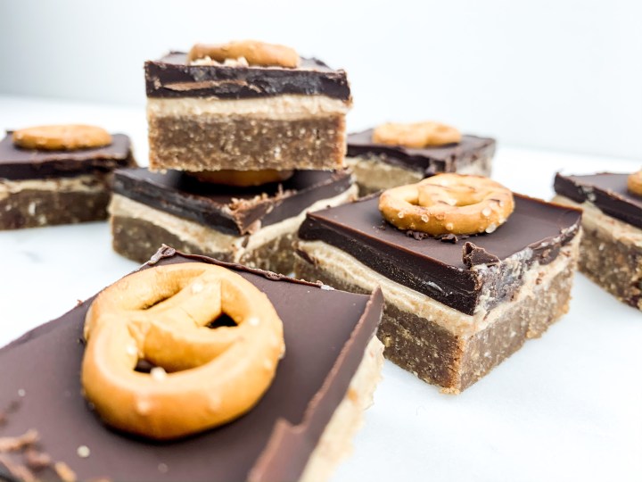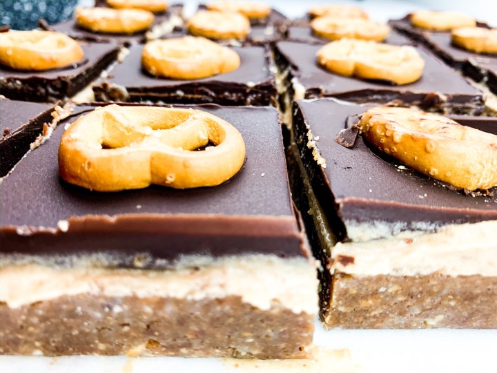- In a food processor or blender, combine crushed pretzels, oats, peanut butter and Medjool dates until broken down and sticky; add coconut oil and water, as needed, for the base to come together. Transfer and press into lined pan; set aside.