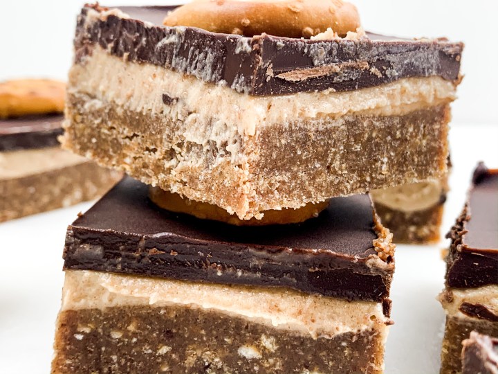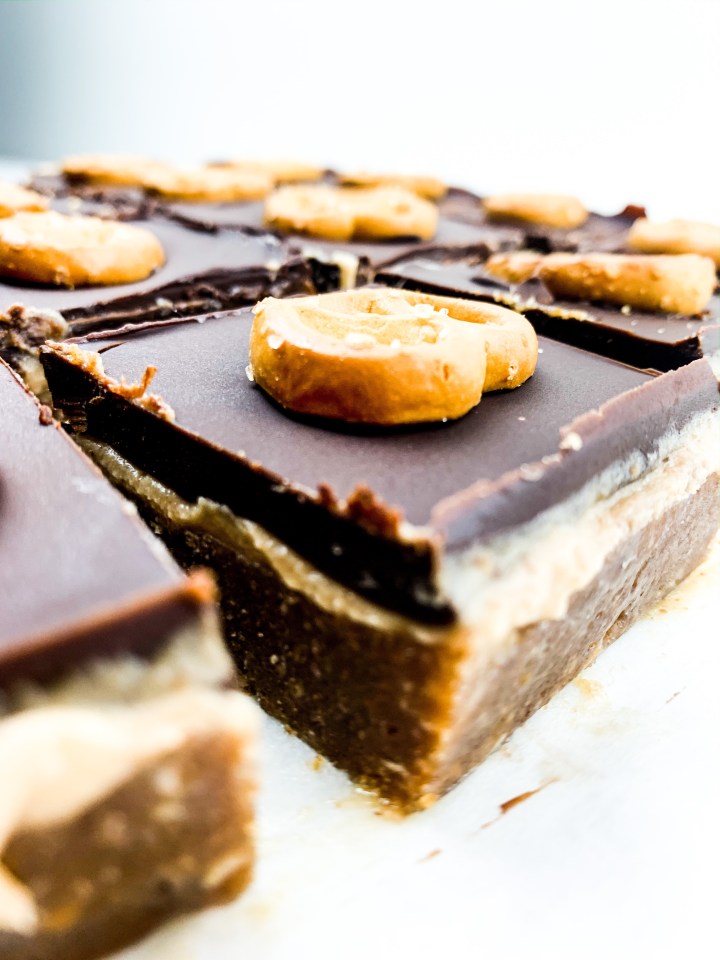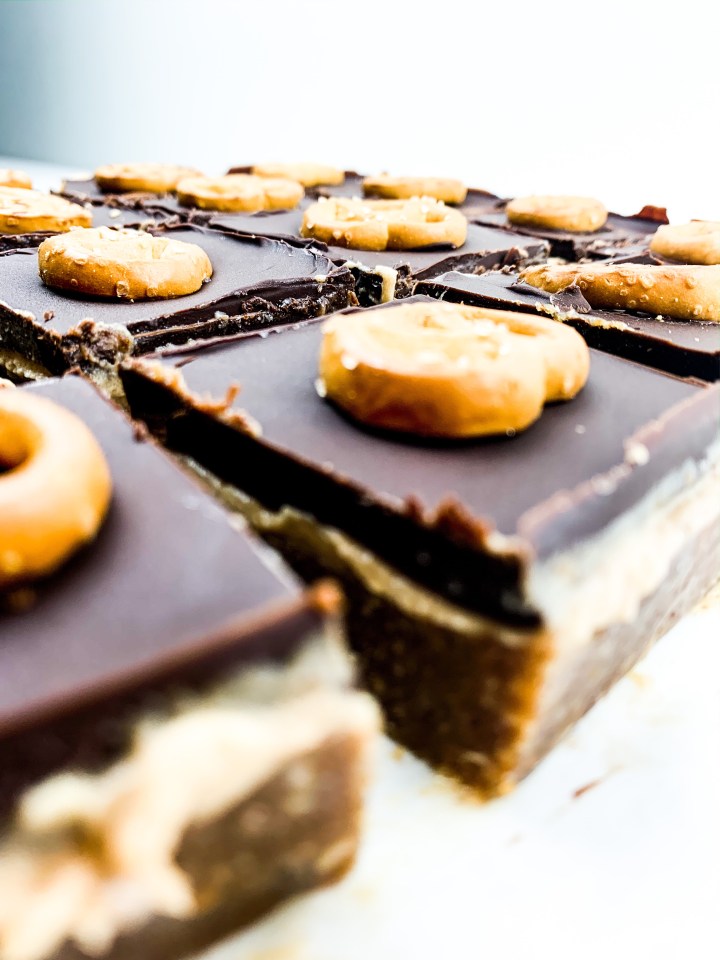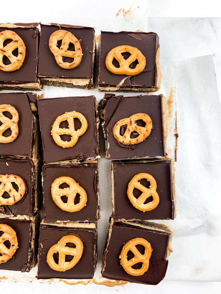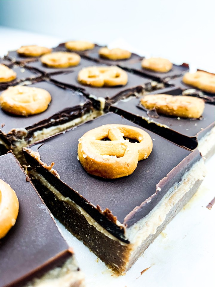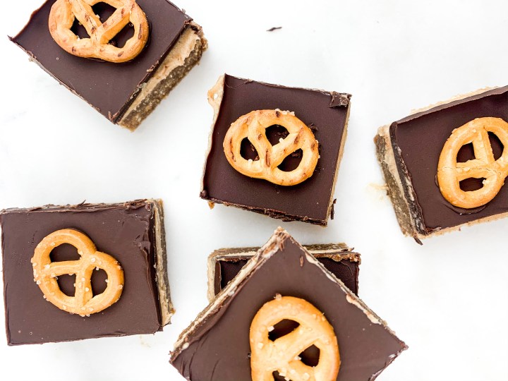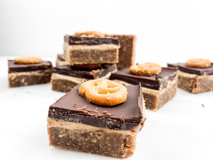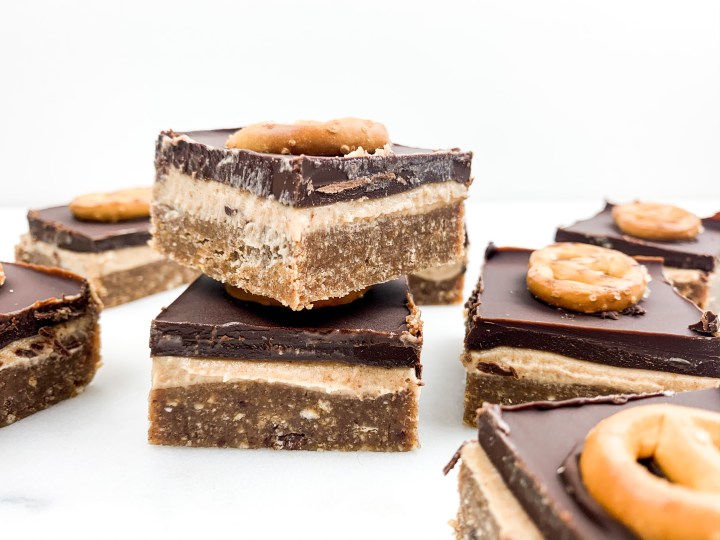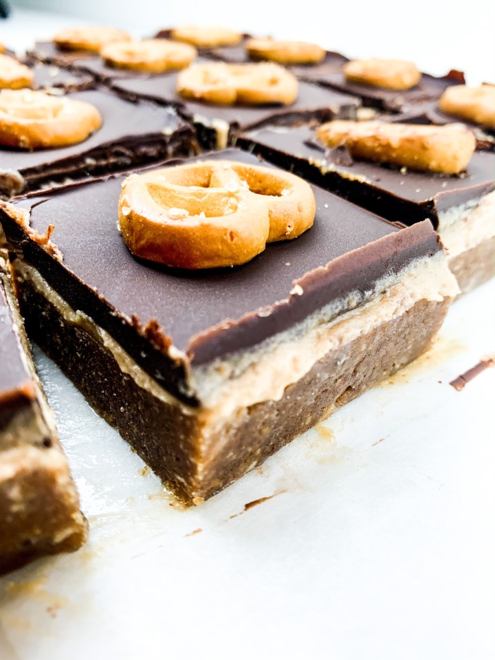 - In a food processor or blender, combine crushed pretzels, oats, peanut butter and Medjool dates until broken down and sticky; add coconut oil and water, as needed, for the base to come together. Transfer and press into lined pan; set aside.