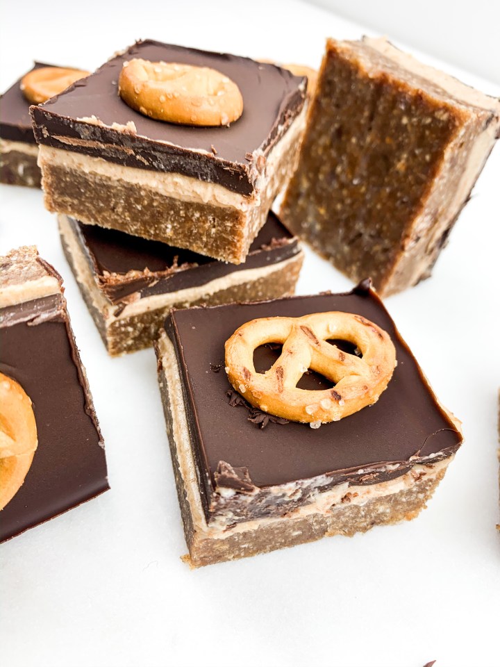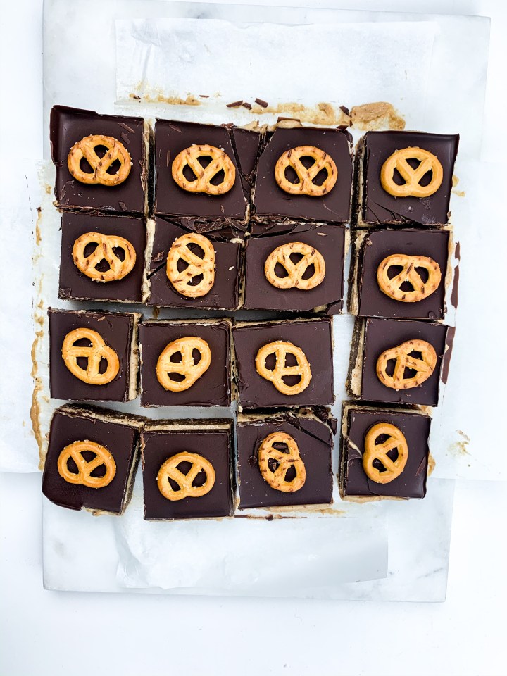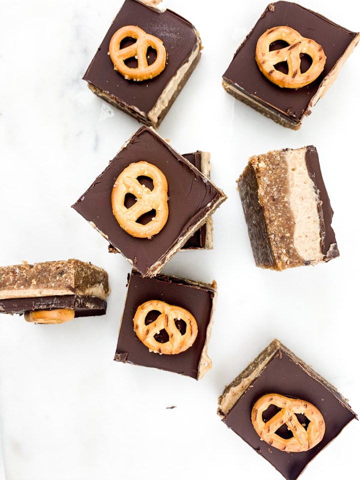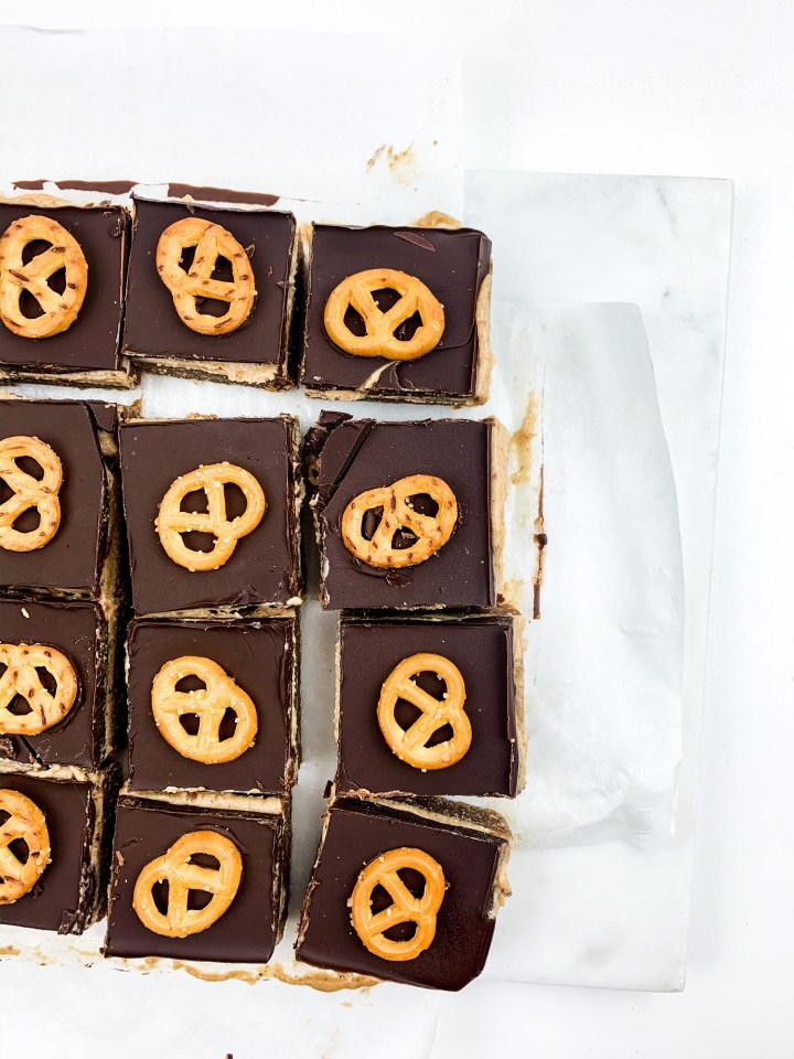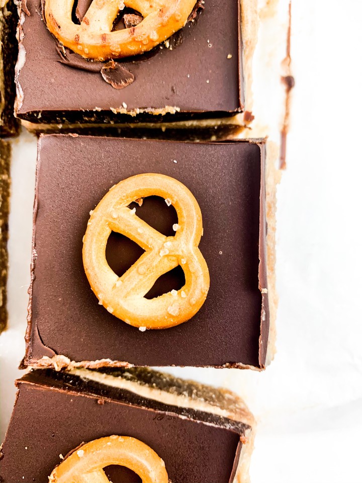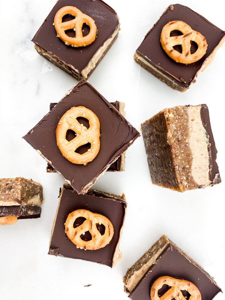 - Melt the chocolate: In a large microwave-safe bowl, in 20-30 second increments, stirring in between as needed. Then add the coconut oil, and stir until melted; stir again before pouring on chilled bars. Top with mini pretzels + sea salt, as desired. Cool in the fridge for 30-40 minutes before cutting into squares.
